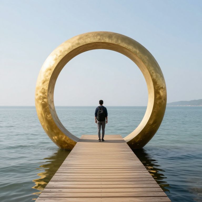 A golden, circular archway emerges from the water like a portal to another realm, inviting a lone traveler along a wooden path that defies the boundaries of ordinary landscapes.