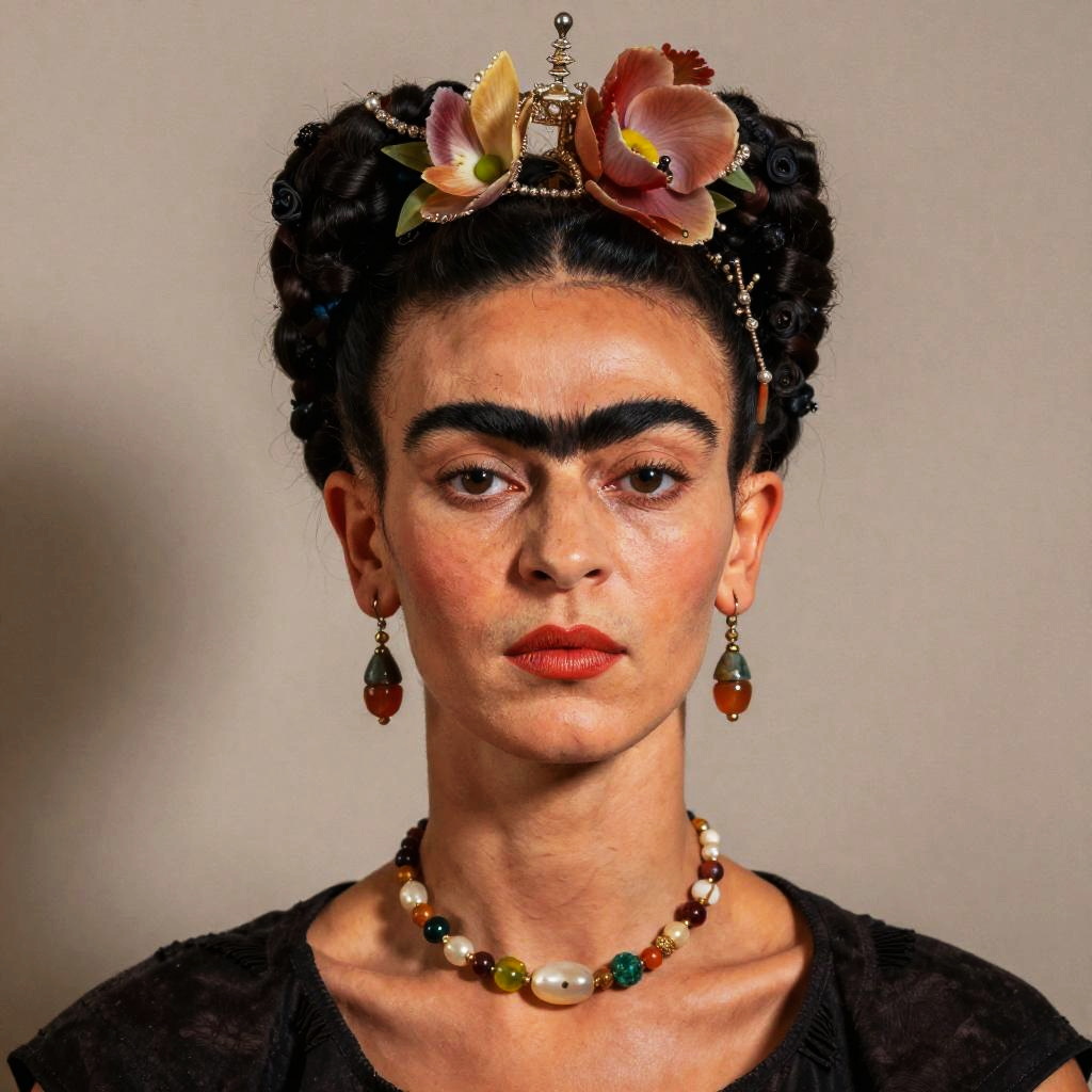 Realistic photo.A portrait in the style of Frida Kahlo, matte painting, detailed and expressive, muted colors, high quality realistic photo