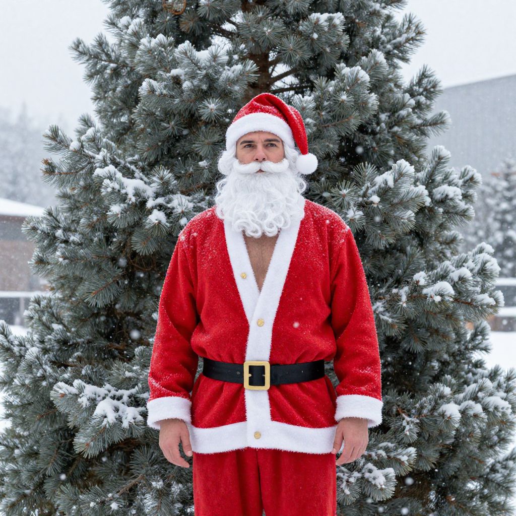 A man wearing a red Santa Claus suit with white trim, standing in front of a snowy pine tree in a winter wonderland setting, soft snowfall in the air, cozy and festive atmosphere