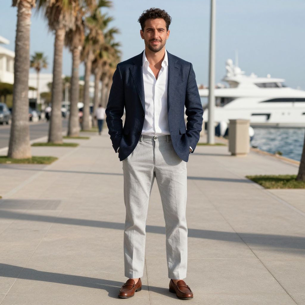 A man, navy linen blazer, white cotton dress shirt, light gray chinos, brown leather loafers, sunlit promenade, palm trees swaying, luxury yachts docked, cri film style, relaxed pose with hands in pockets, confident smile.Man has masculine face and piercing eyes
