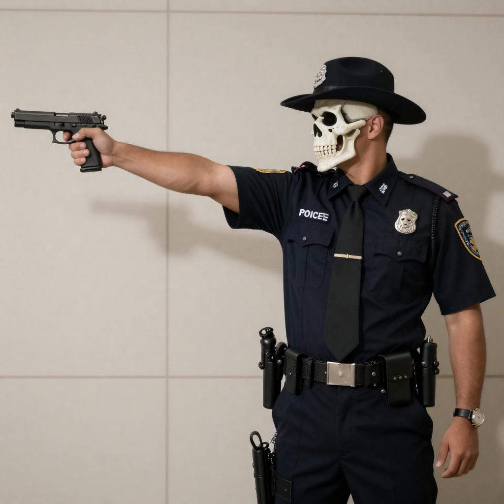 Photograph of a male police officer with a skeleton face, wearing a police uniform, black hat, and tie, pointing a handgun to the left. Background: beige tiled wall. Officer's right arm extended, left arm by side. Shadows on wall.