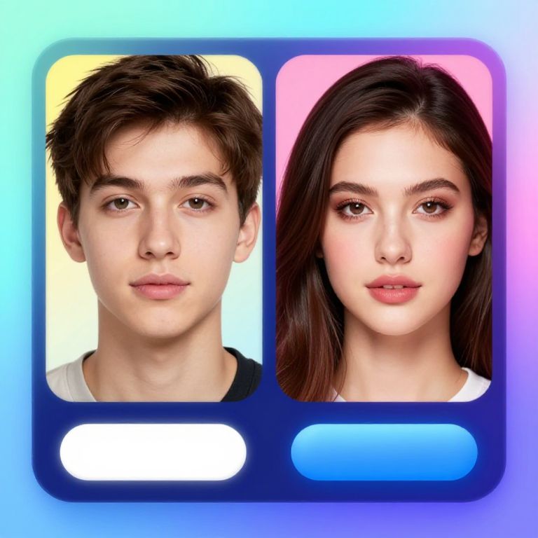 Digital male to female photo changer online application, showing before and after side-by-side portraits, vibrant colors, detailed facial feature adjustments, modern tech aesthetic with smooth gradients and glowing buttons.