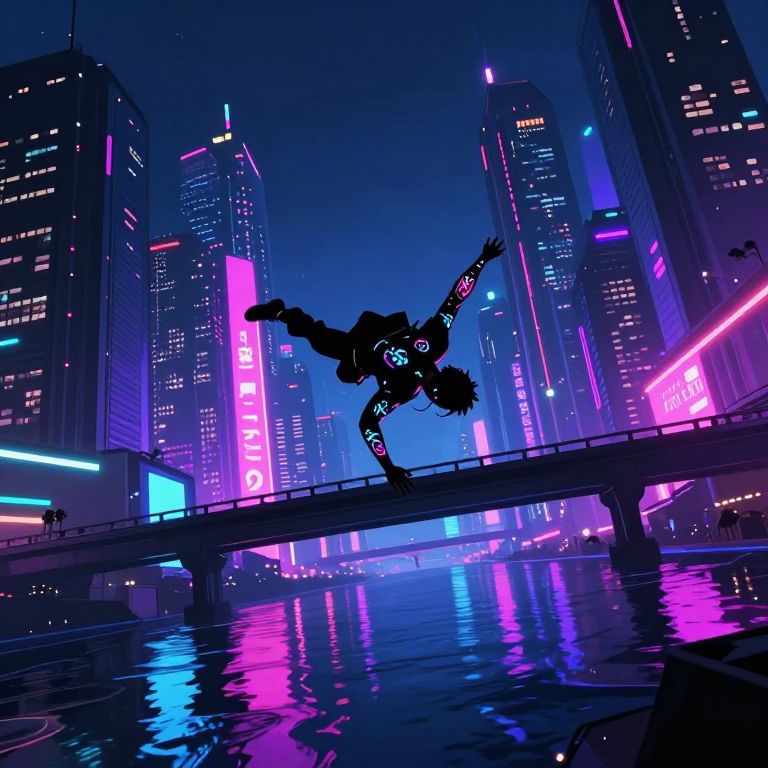 Silhouetted breakdancer mid-flip on bridge, neon-lit futuristic cityscape with vibrant blue, pink, and purple lights reflecting on