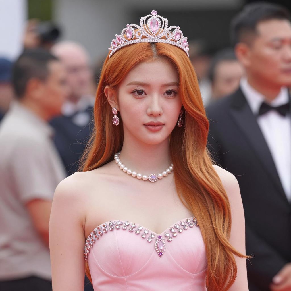 Photograph of three people in an indoor setting. Woman with brown hair, wearing a strapless gold dress, holds a wrapped gift with a yellow bow. Bald man in a dark suit with a white shirt and tie stands to her left. Man in a beige police uniform with a yellow patch stands to her right. White flower bouquet and blue cloth on a table in the foreground. Soft yellow lighting. Woman looks forward, man in suit looks down, man in uniform looks away.