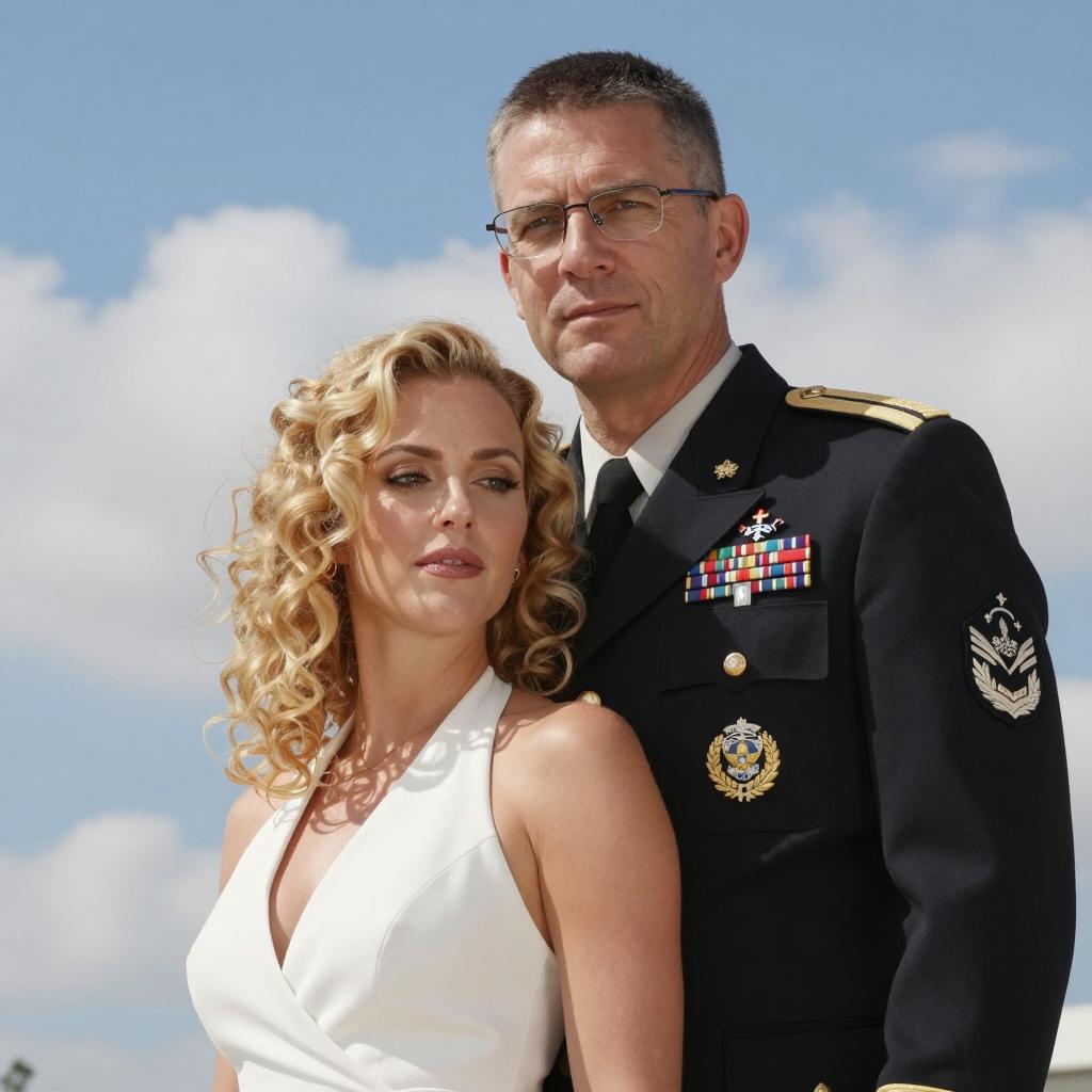 Two people against a blue sky with white clouds. A blonde woman with curly hair in a white halter top stands in the foreground. A middle-aged man with glasses, wearing a dark military uniform with medals and a name tag, stands behind her. The man's head is slightly tilted, resting on hers. The man's eyes are focused forward, while the woman's eyes are slightly downward. The man's uniform has a patch on the right sleeve and several ribbons on the left.