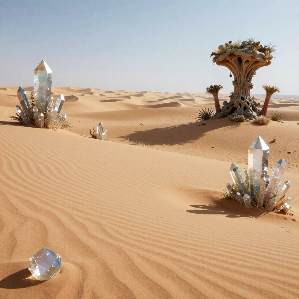 Fantasy biomes featuring sprawling crystal deserts with sparkling sand dunes and alien plants, surreal and mystical atmosphere