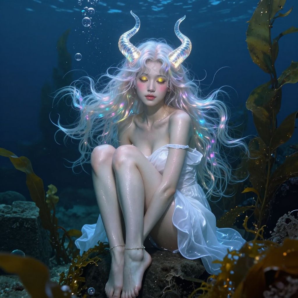 Best shadow, (ethereal style:1.05), intricate light, reflection light, (scenery:1.05), (([(dark blue deep ocean seabed:1.6)|(deep ocean bubble:1.6)|(light particles:1.35)|(bioluminescence:1.1):50]):1.05), (looking at viewer:1.05), 1girl, solo, sitting, knees up, cure lovely, (curvaceous, wide hips:1.2), (shiny skin:1.45), (oil highlight:1.2), oil skin, wet, (thick thighs:1.75), (bare legs:1.5), round face, collarbone, bare shoulders, (barefoot:1.15), (off shoulder:1.15), (white long dress:1.05), anklet, (([(holographic long hair:1.5)|(Galaxy:1.15):50]):1.15), (very long hair:1.5), (floating hair:1.5), (glowing complicated horns:1.15), (yellow eyes:1.05), (half-closed eyes:1.05), blush, (seductive smile:1.15), closed mouth, (kelp forest:1.35), (Sargassum:1.25), Dim light, (([(seaweed:1.05)|(stone cube:1.0)|(abyss:1.15)|(seagrass:1.2):50]):1), (shipwreck:1.15), (translucent body:1.9), (translucent hair:1.9)