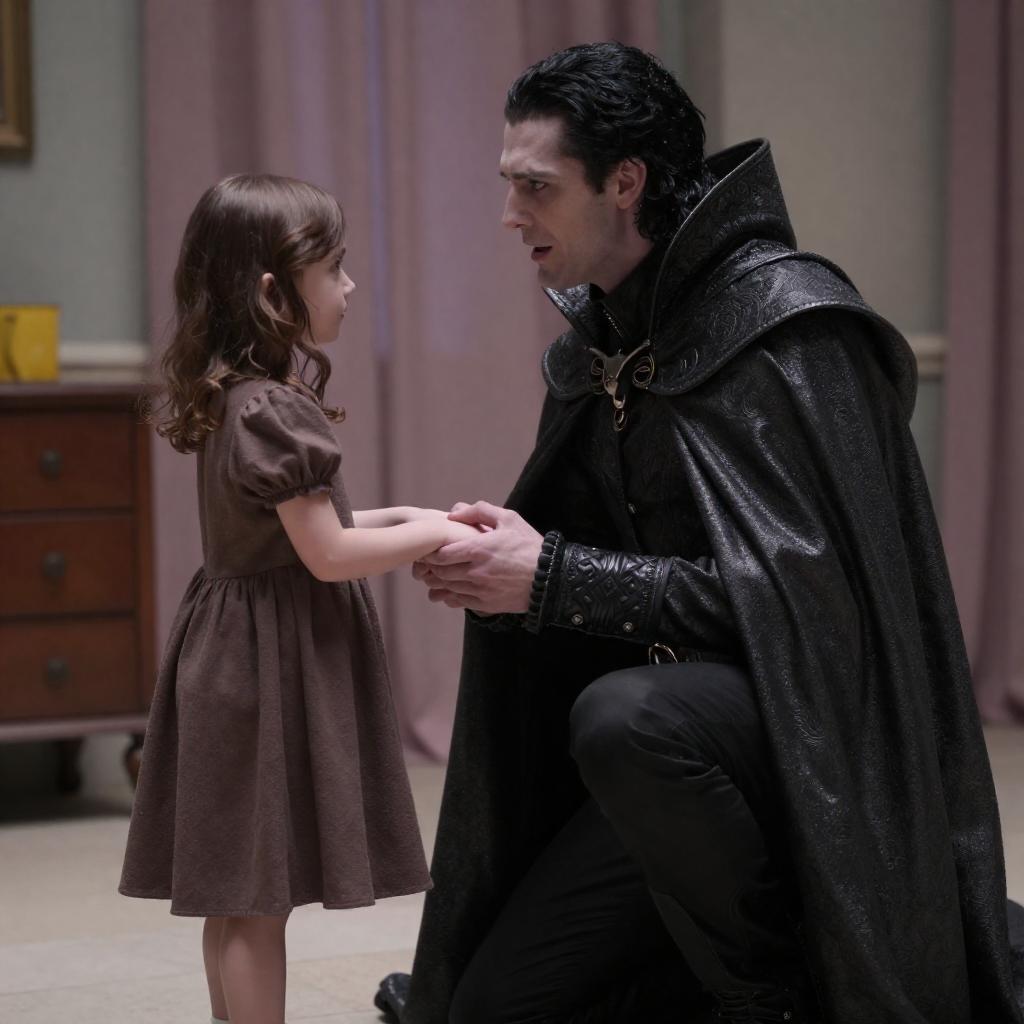Photograph of two smiling children with curly hair, wearing elaborate, ornate costumes with ruffles and bows. The girl on the left has light brown hair, the boy on the right has red hair. Both wear dark cloaks. Dimly lit, warm-toned background. The girl's face is slightly turned towards the boy, who is leaning close.