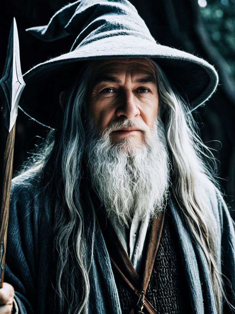 Man in Gandalf costume, waist-up editorial fantasy portrait, cinematic lighting