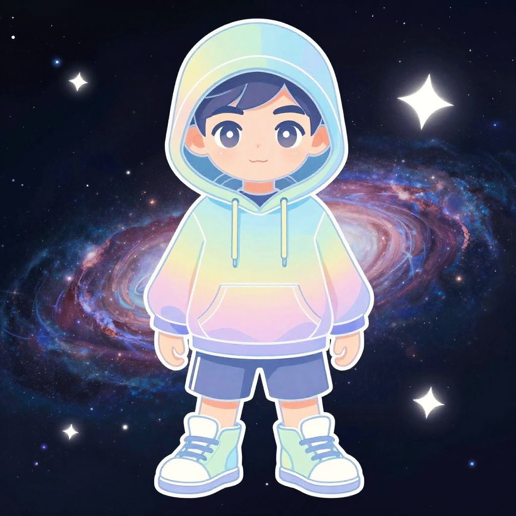 Realistic photo.Isometric full-body portrait of a boy, pastel thin linework, wearing a colorful hoodie, anime style, glowing accessories, galaxy background, vector illustration, isolated, adorable, beautiful, fantasy. realistic photo