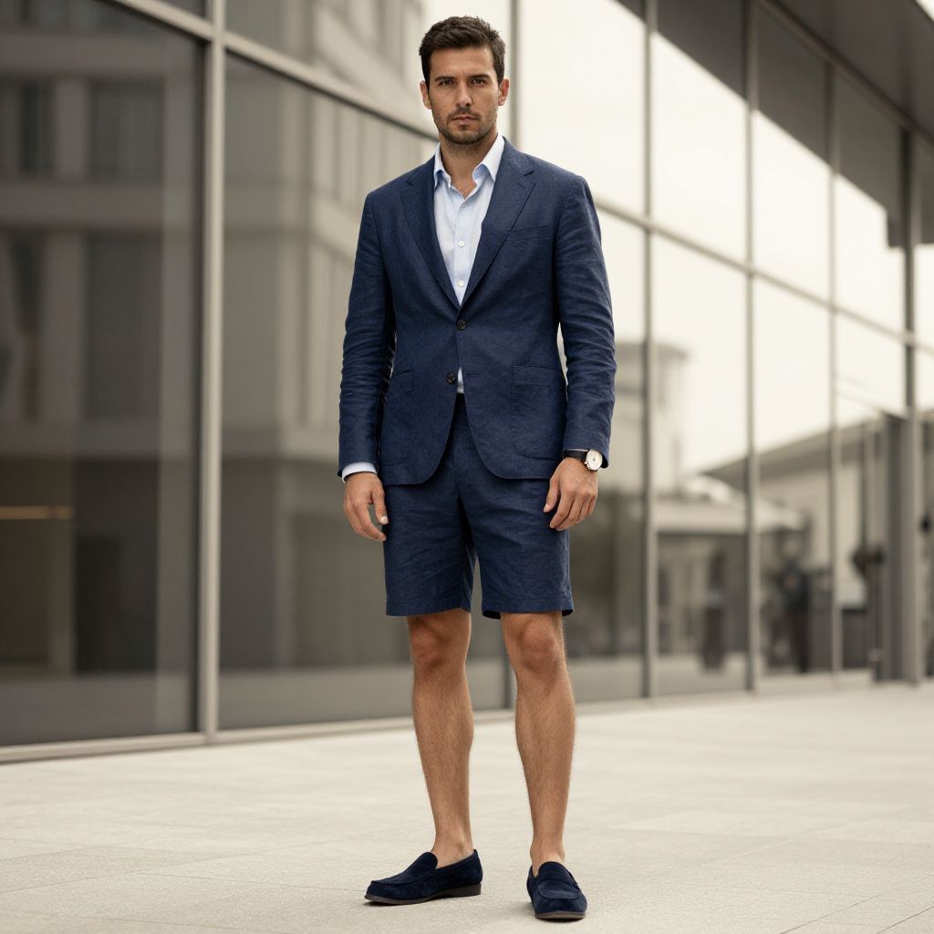 A man, navy blue linen suit, lightweight blazer, tailored shorts, light blue cotton shirt, navy suede loafers, minimalist watch, modern glass facade, reflective windows, sepia effect, confident expression Man has masculine face and piercing eyes