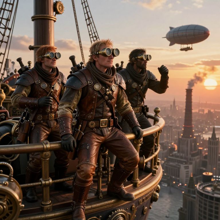 Steampunk marauders aboard a flying ship, clad in patched leather and brass goggles, high above a sprawling cityscape with smokestacks and airships, the sky painted in warm sunset hues, intricate mechanical details, dramatic perspective.