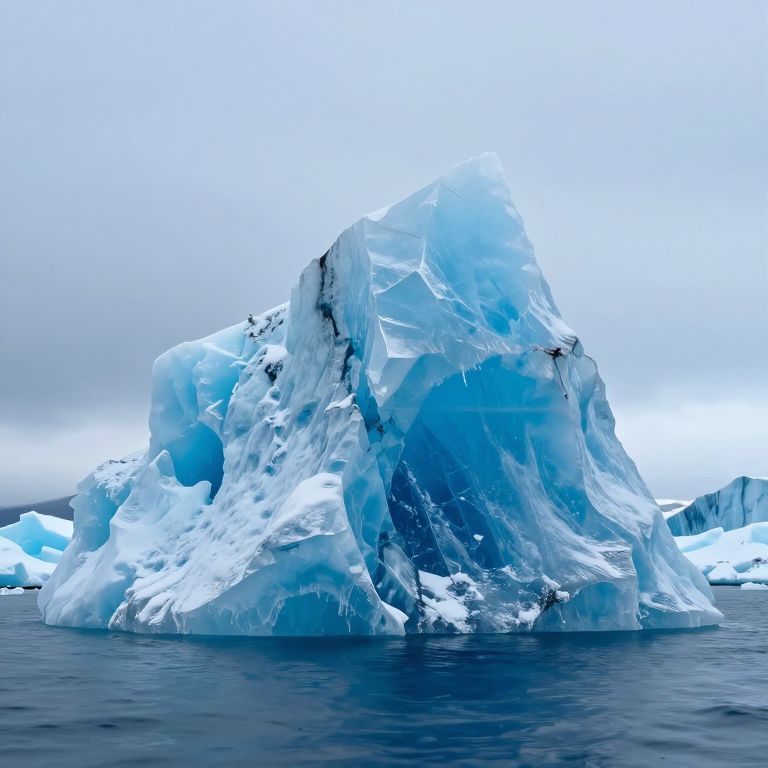 An ethereal iceberg stands as a monument of serenity and transience, its crystalline blue depths resonating with the quiet symphony of melting ice, while the crisp, cool air whispers tales of forgotten dreams and the eternal dance between fragility and endurance.