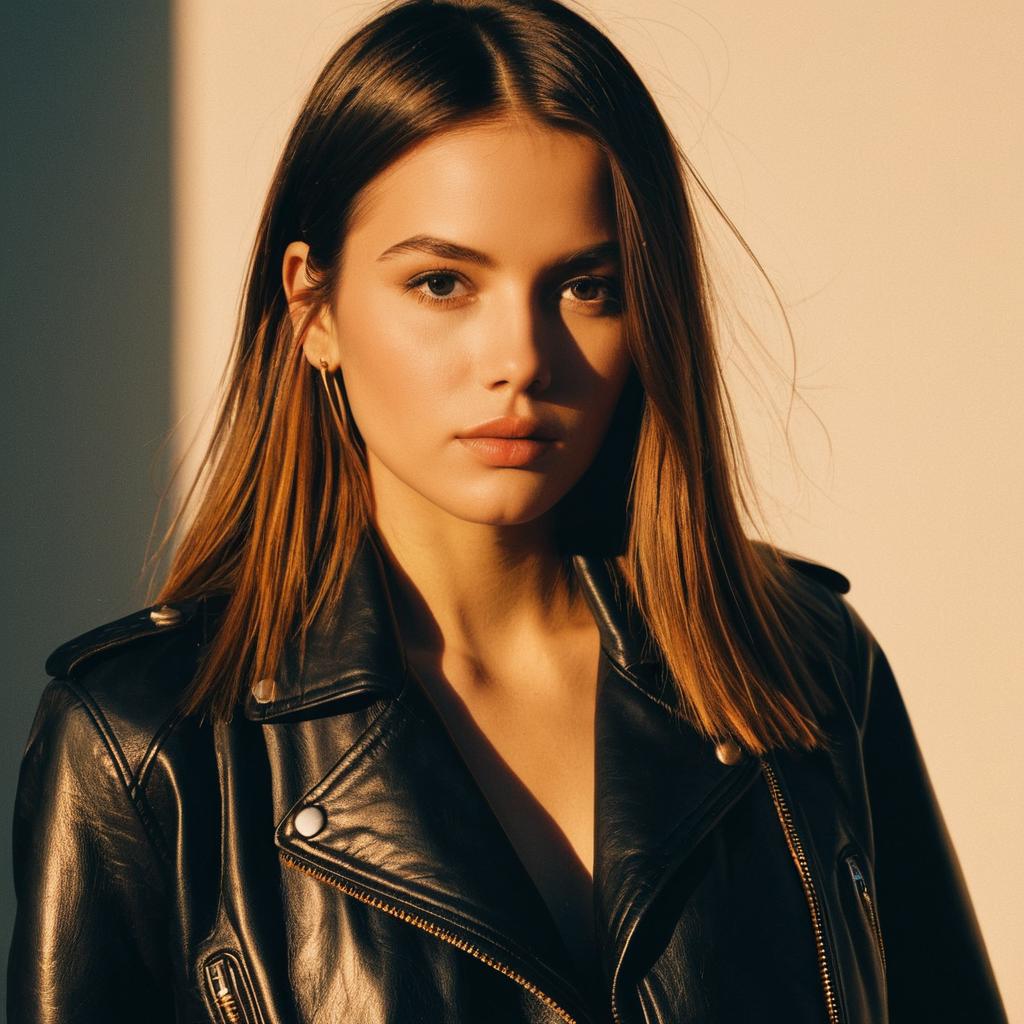 Blunt Straight hairstyle on fashion model, wearing additionally embellished leather jacket, in rodeustore loft, captured in fashion editorial style with harsh overhead spotlight.