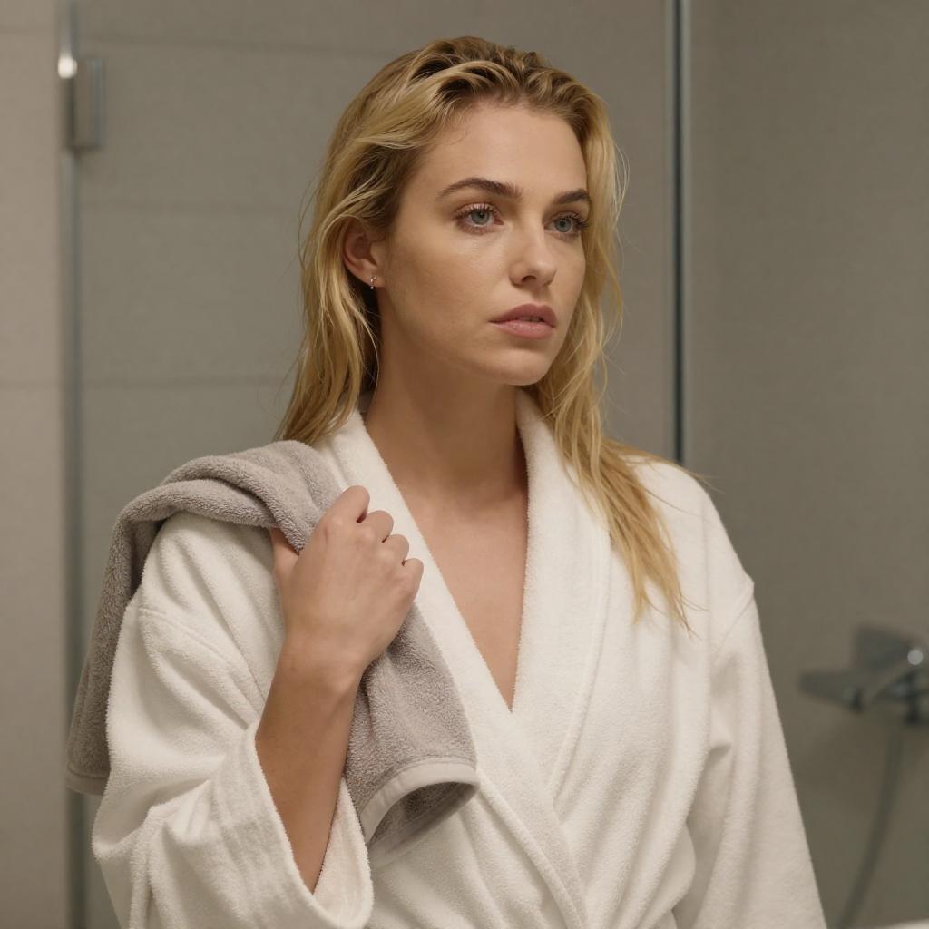 Photograph of a blonde woman with wet hair, wearing a white bathrobe, holding a gray towel over her shoulder. She stands in a modern bathroom with a glass shower door in the background. Warm light highlights her face, creating a soft, intimate atmosphere. Her expression is calm and slightly introspective.