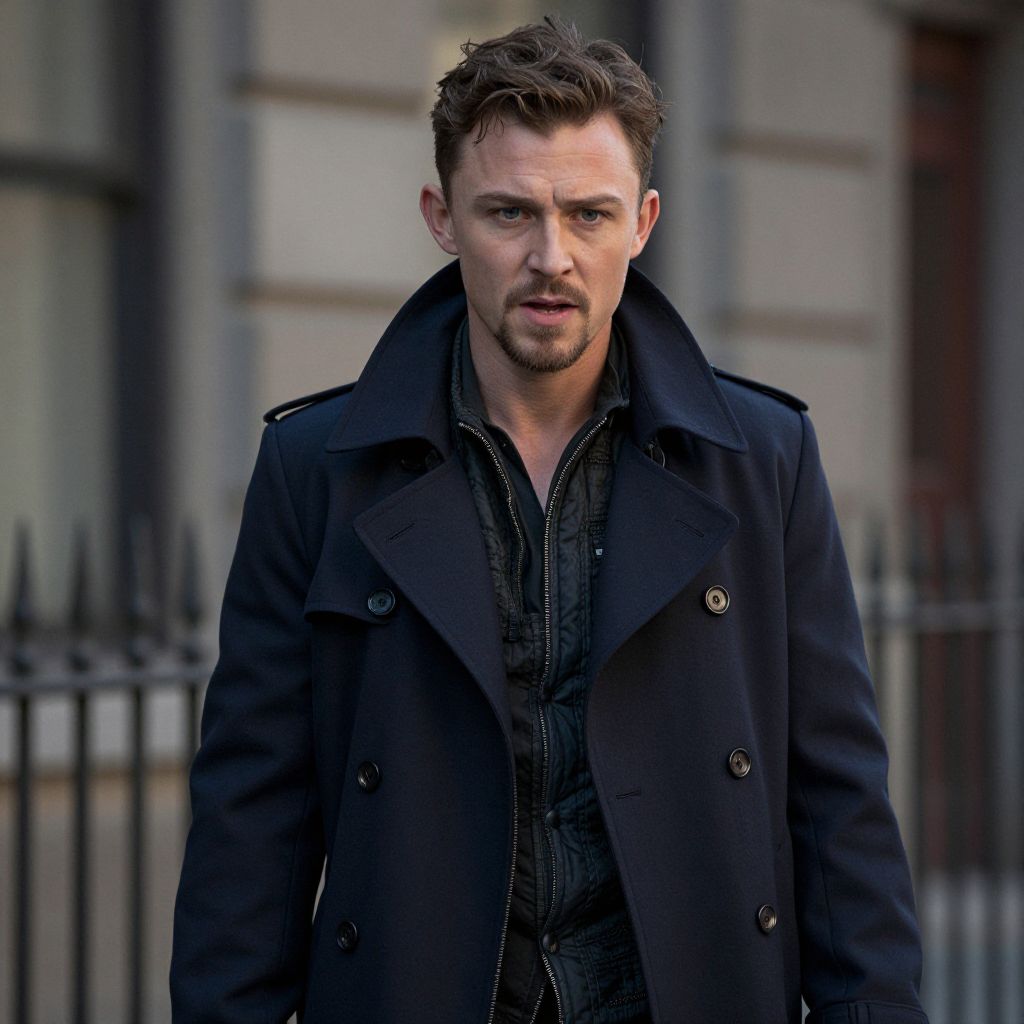 Tom holland as a rough dirty old man with a scruffy beard in a dark blue trenchcoat as the new doctor who, cinematic, volumetric lighting, f 8 aperture, cinematic eastman 5384 film, photorealistic by greg rutkowski