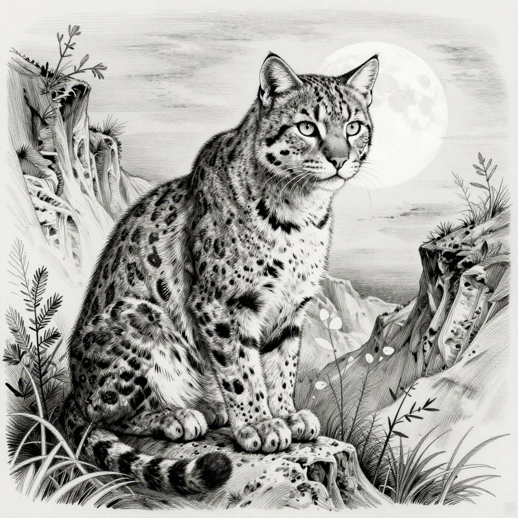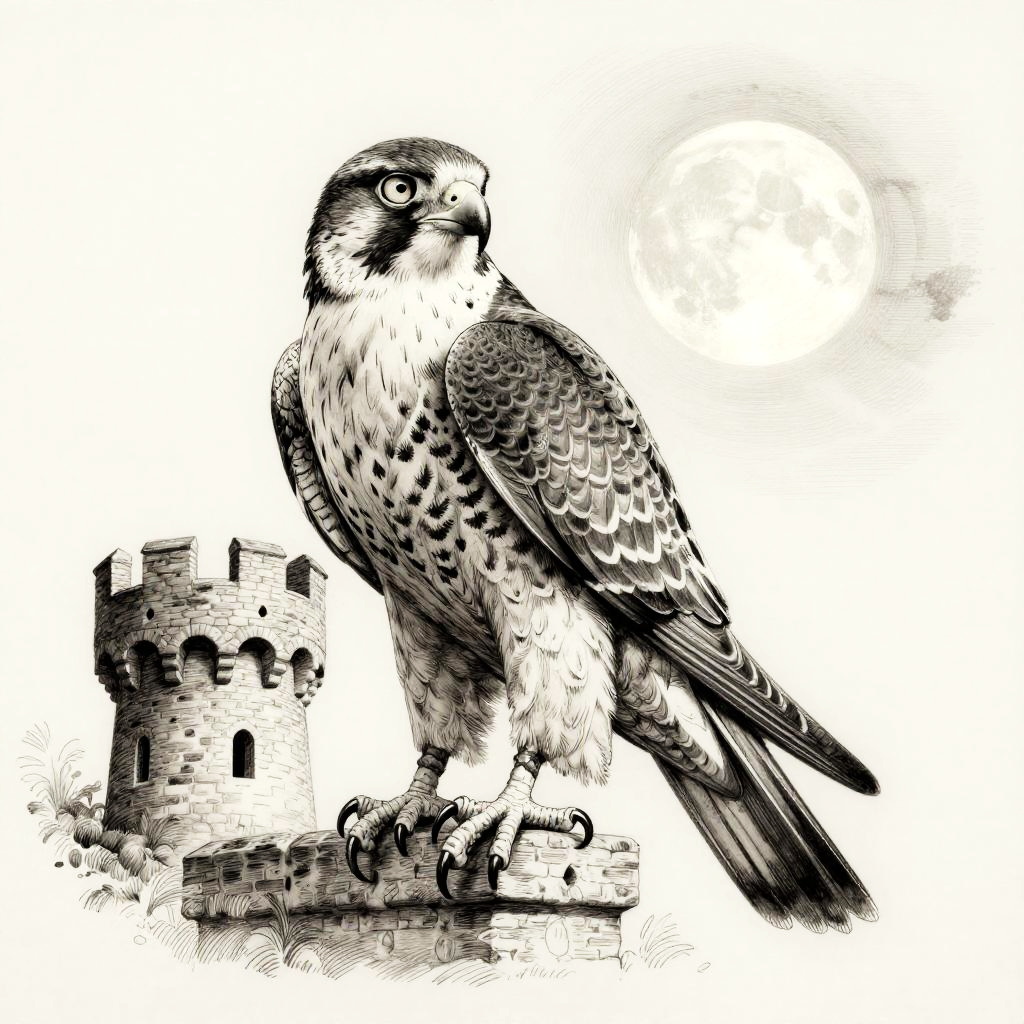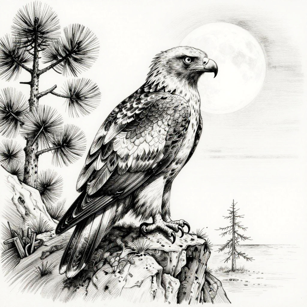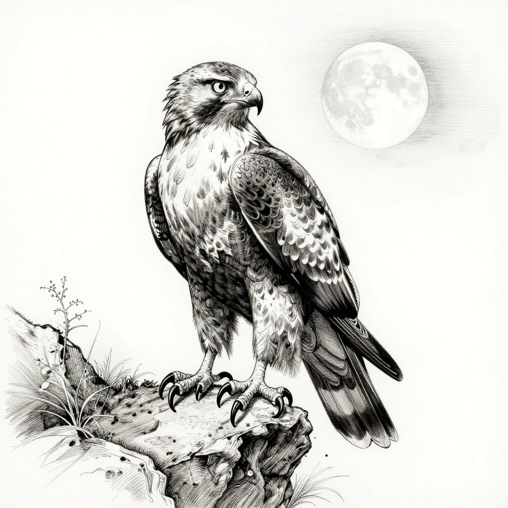 Intricate pen and ink drawing of a fierce hawk perched on a rocky cliff edge, with the moon glowing softly in the background, sharp talons gripping stone and intense stare.
