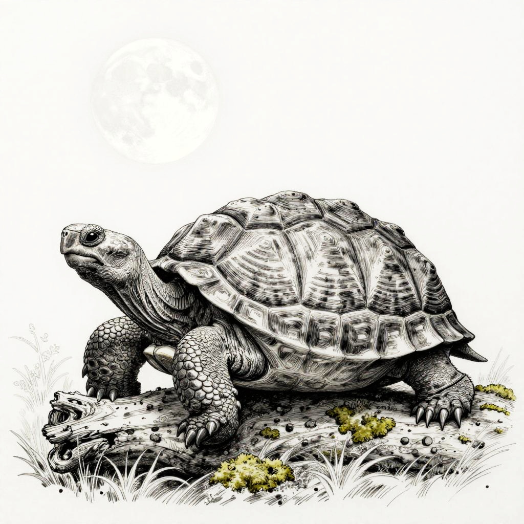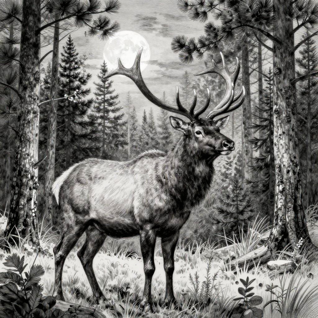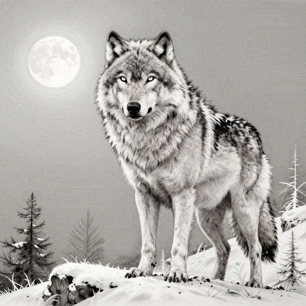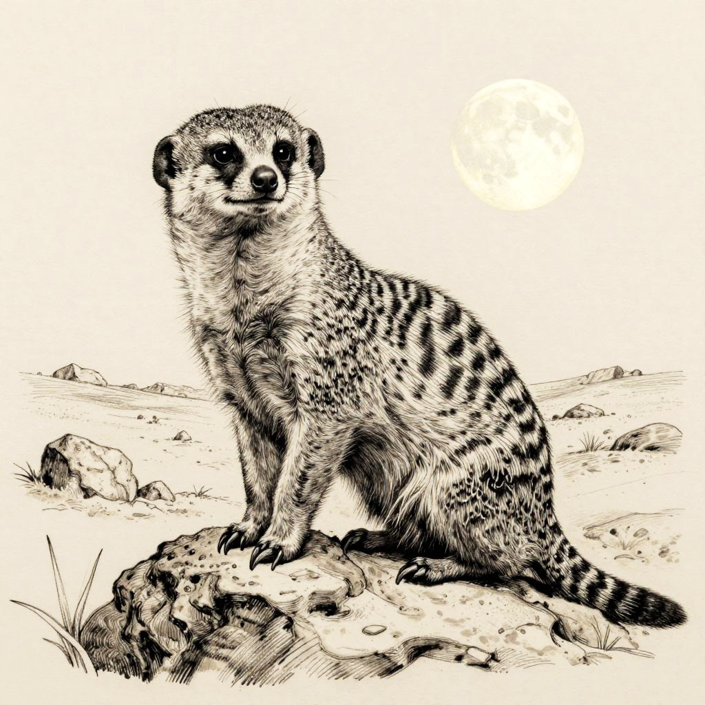 Intricate pen and ink drawing of a fierce hawk perched on a rocky cliff edge, with the moon glowing softly in the background, sharp talons gripping stone and intense stare.
