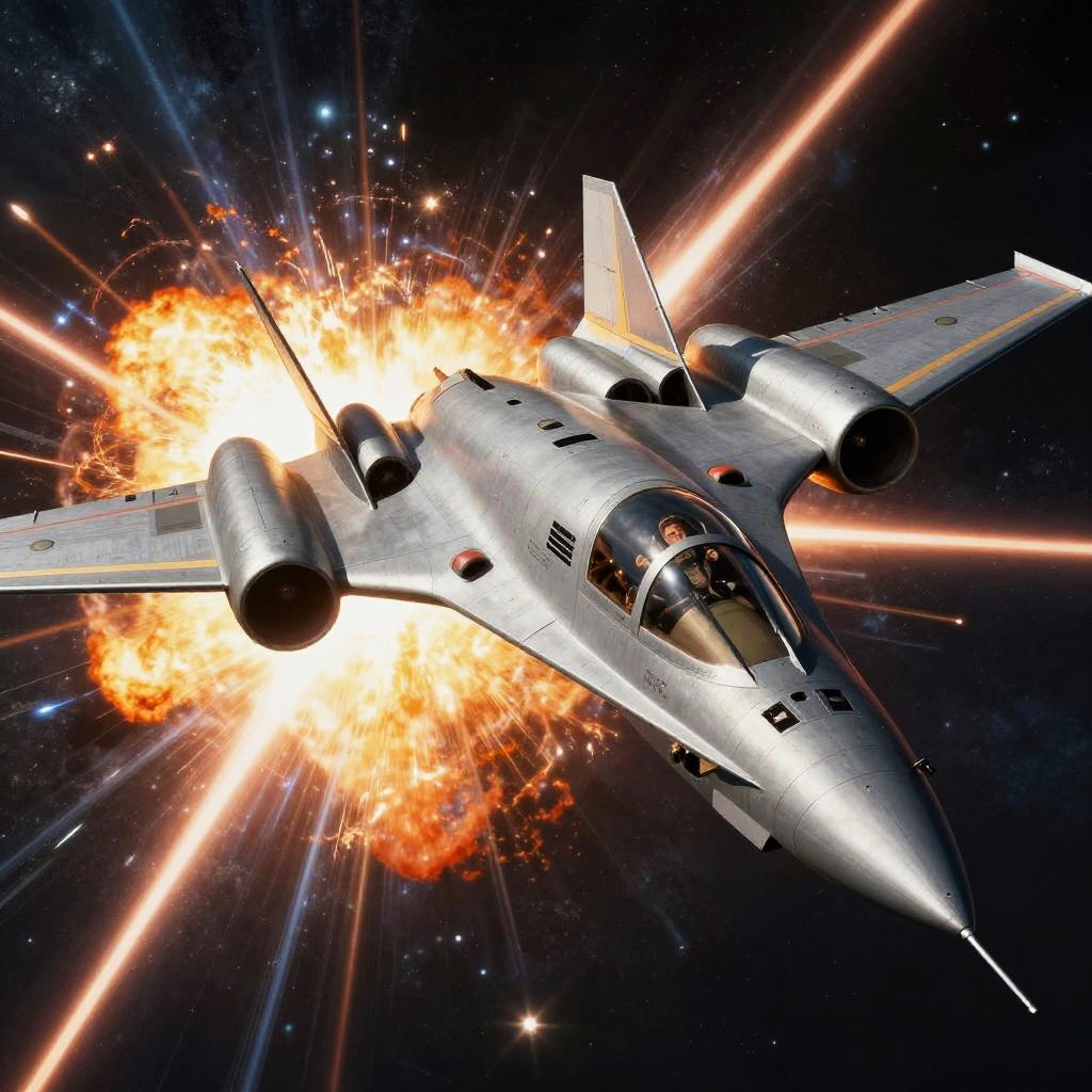 Bucky O'Hare Jenny piloting a sleek starfighter, intense space battle scene, explosions and laser beams, vivid color palette, high detail, dynamic composition