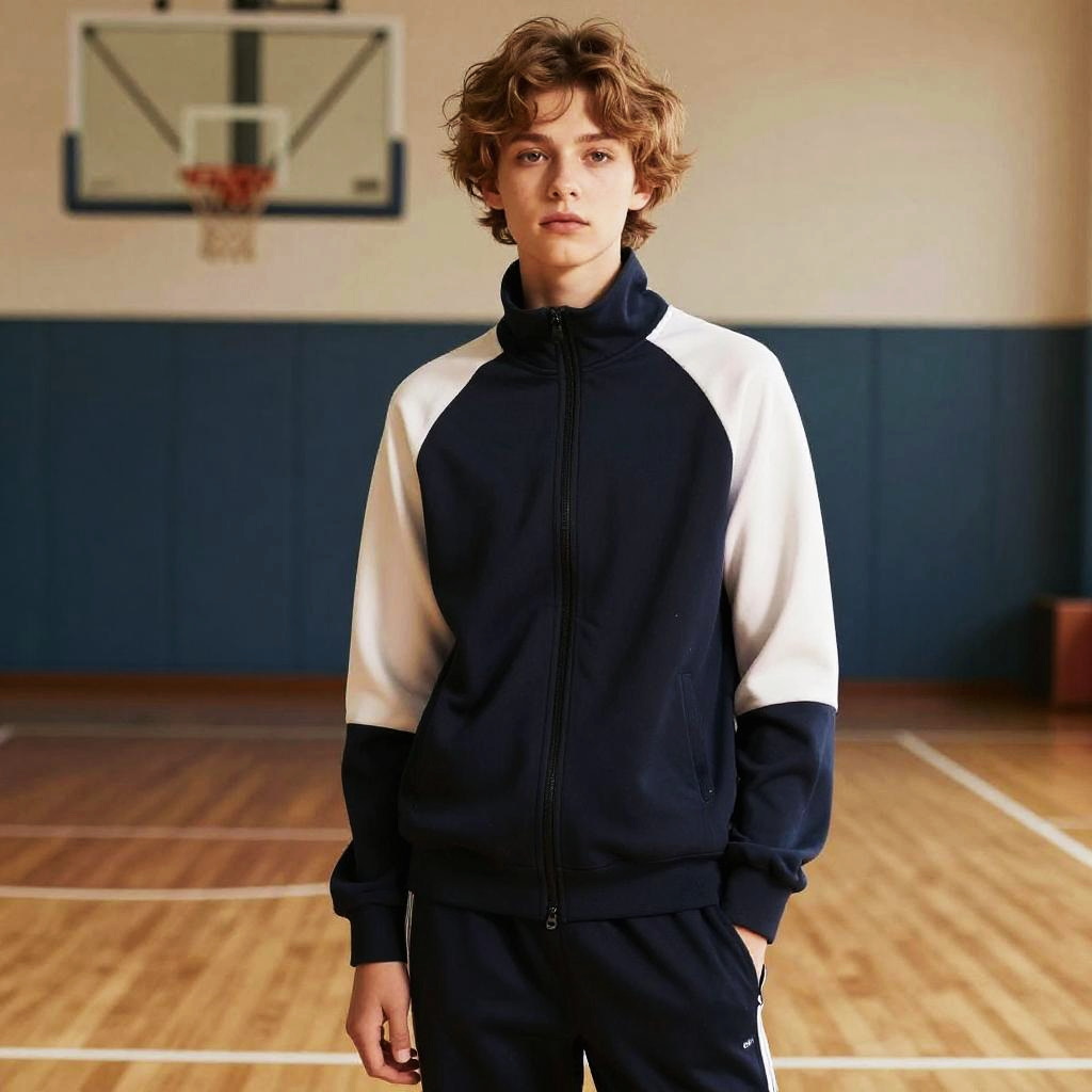 Photograph of a young white boy with curly brown hair, wearing a black tracksuit with white stripes, standing in a brightly lit basketball gym with blue