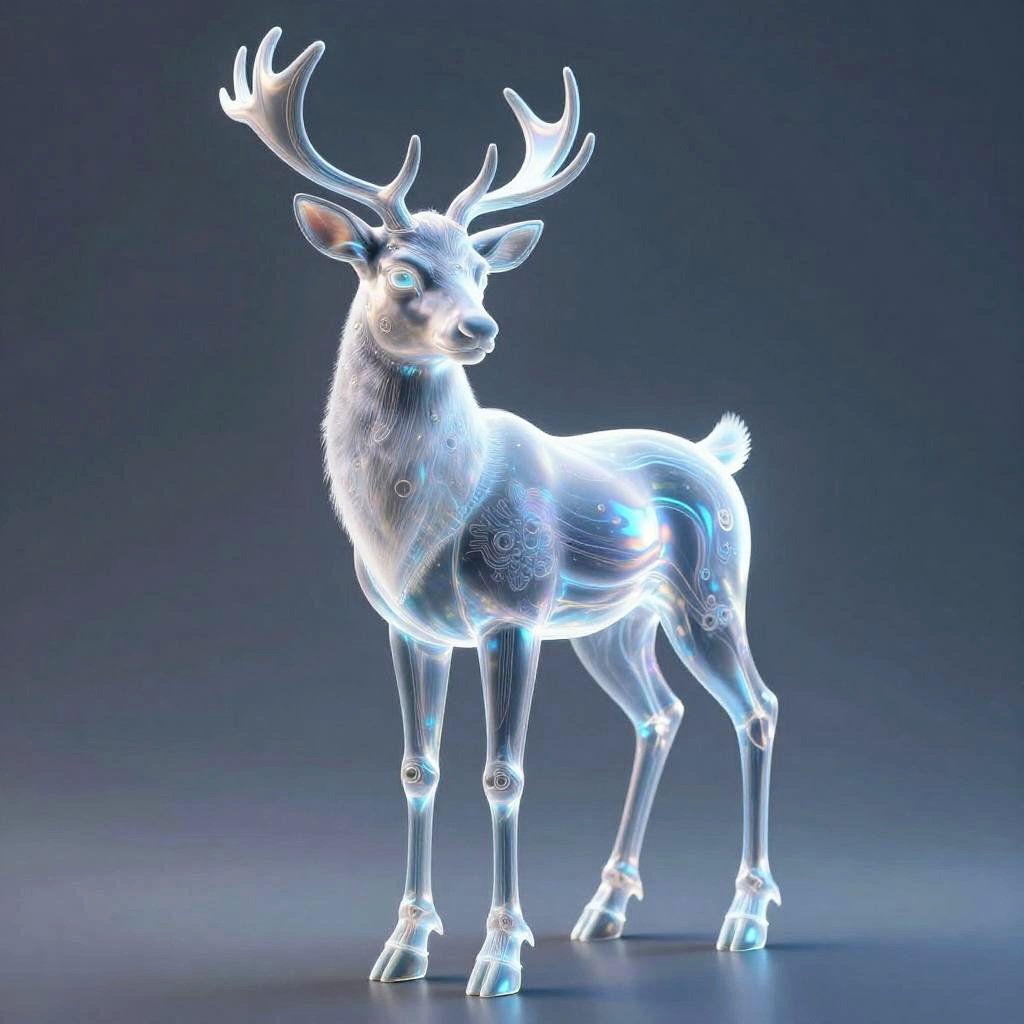 Photorealistic CGI of a glowing, transparent white deer with intricate patterns, standing against a dark blue gradient background.
