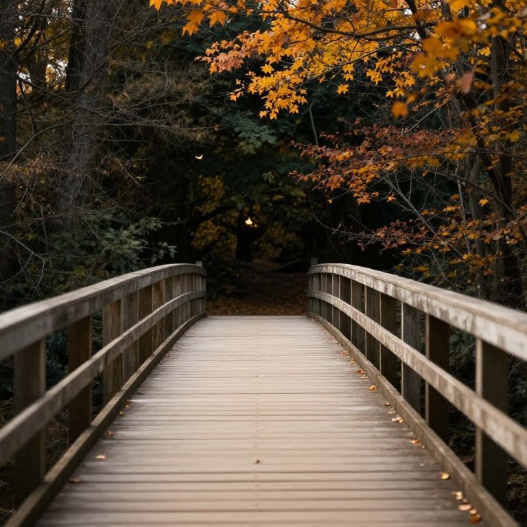 Photograph of a wooden bridge in a forest, leading into a dark, leafy path. Bright orange autumn leaves contrast against the shadows, creating a