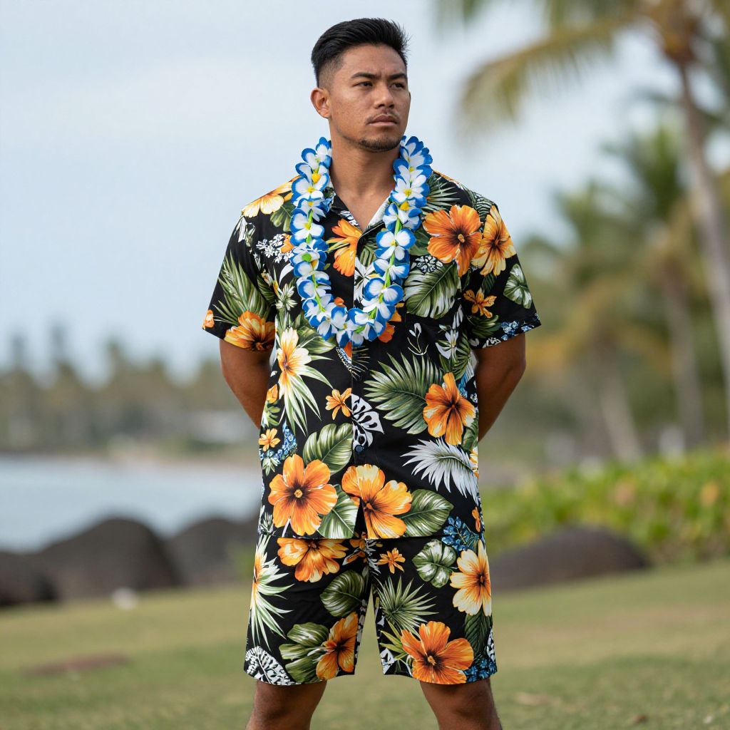 Photograph of a young Asian man standing outdoors, wearing a black floral Hawaiian shirt and matching black shorts adorned with vibrant orange, yellow, and white flowers. He has short black hair and a neutral expression. Around his neck, he wears a blue and white floral lei. The background features a blurred tropical landscape with palm trees, green grass, and a distant body of water. The bright colors of his outfit contrast with the natural green and blue hues of the background, highlighting his presence in the scene.