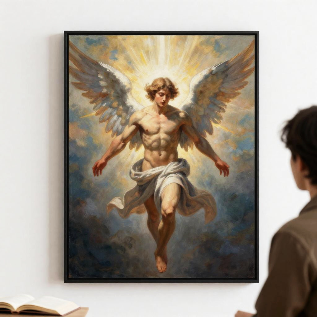 Painting of a muscular, nude, angelic figure with large wings, radiating light from a central point. Framed, hanging on a white wall. Partially visible person on the right, dark hair, brown jacket, looking at the painting. Open book on the left.