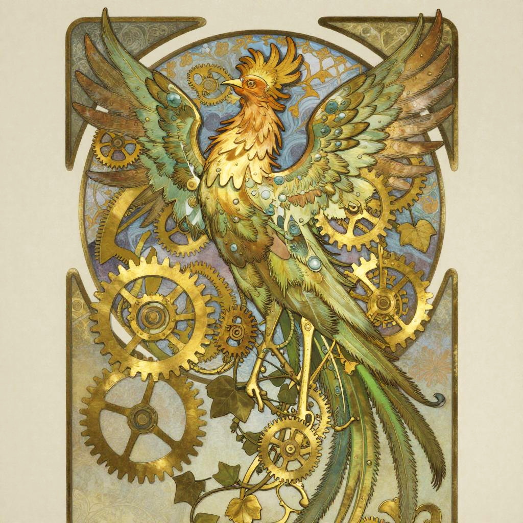 Inspired by the works of Alphonse Mucha, a celestial phoenix adorned with intricate brass gearwork entwined with ivy, illustrating the seamless connection between nature and technology in a captivating art nouveau style.