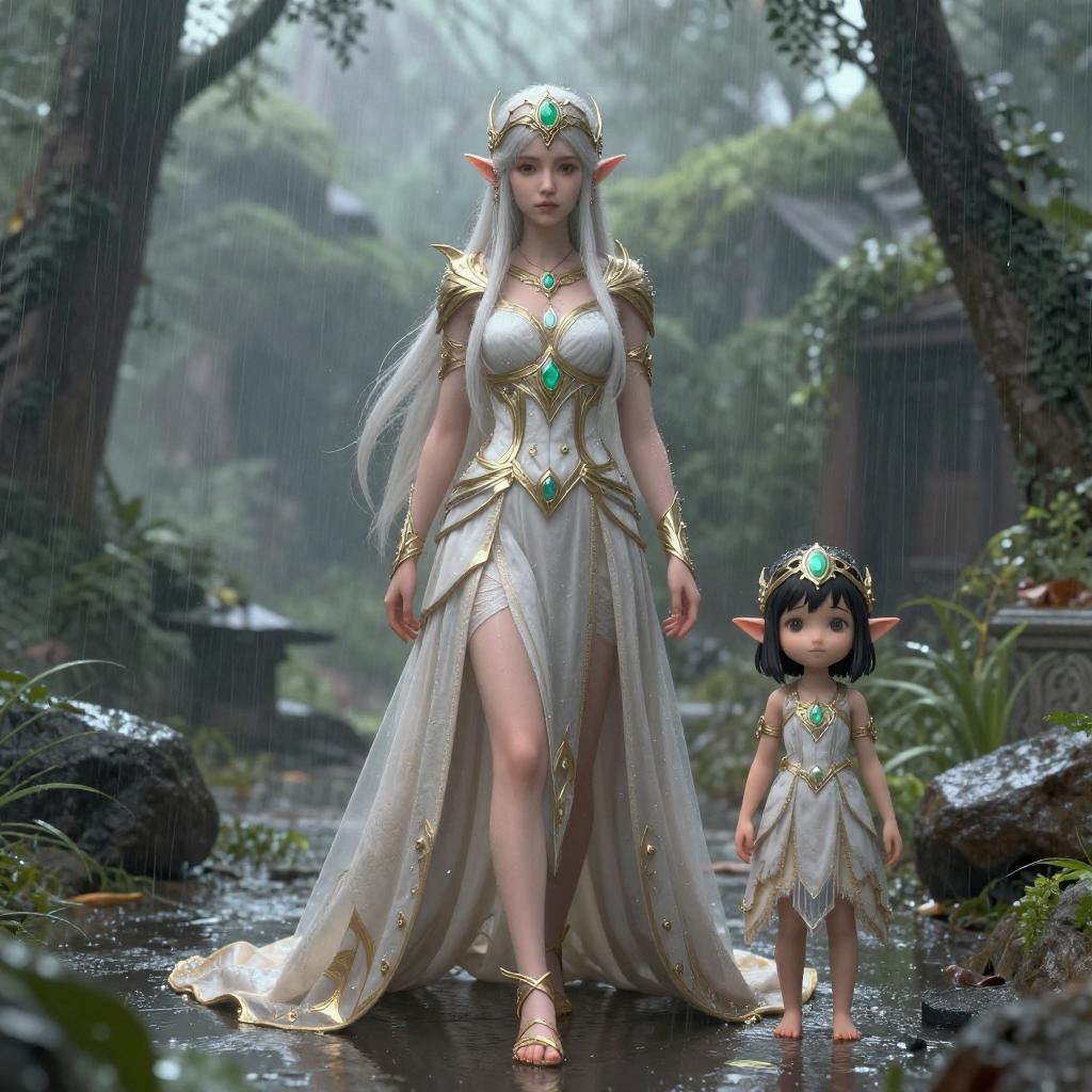 Estilovintedois, (extremely detailed CG unity 8k wallpaper), (masterpiece), (best quality), (realistic), (((bestя┐╜quality))), ((ultra-detailed)), cyberpunk, summer, rain, sharp, rule of thirds, elven empress, long hair, headdress, (((child))), (kid), elf, pointy ears, solo, intricate dress, looking at viewer, fullbody, ((beautiful girl))
