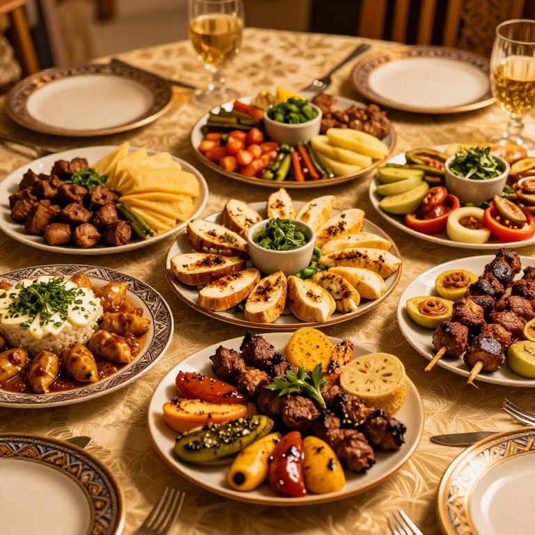 Comida delicious Middle Eastern feast with colorful mezze plates, grilled meats, fresh herbs, ornate table setting, warm golden lighting, rich textures, inviting and appetizing