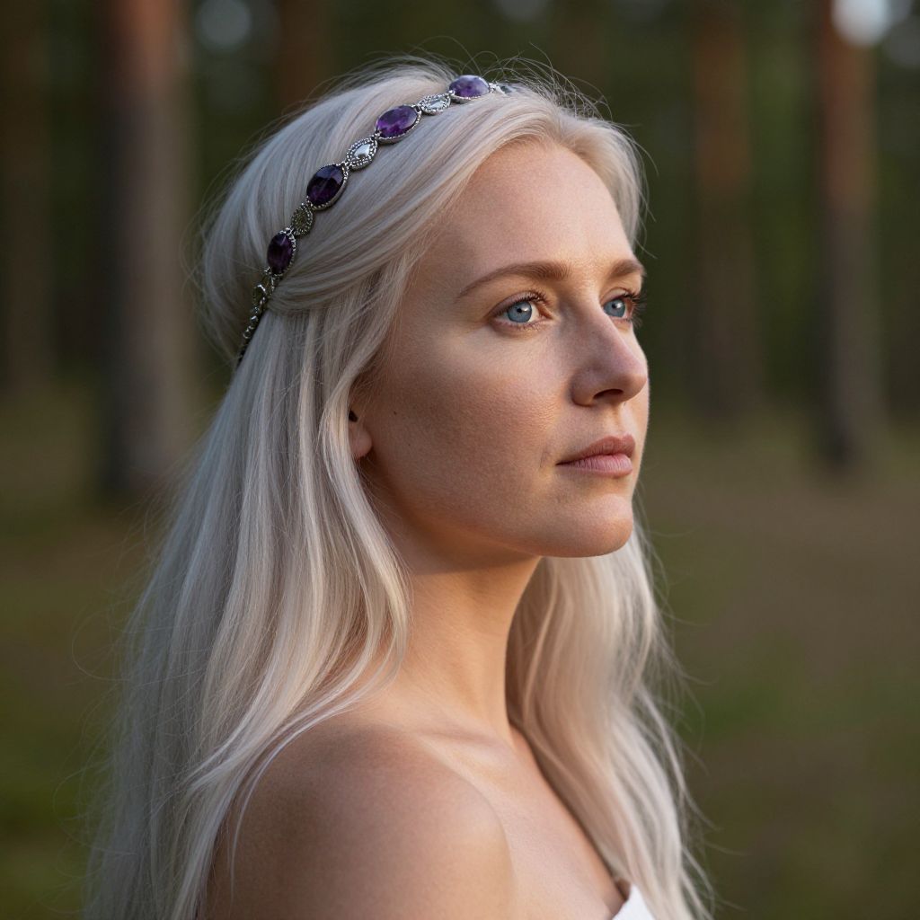 Imagine a photorealistic portrait of a Nordic woman with deep blue eyes and flowing platinum hair adorned by a silver headband woven with amethysts. She stands in a peaceful forest clearing at golden hour, her expression shifting between contemplation and serenity as she gazes off into the distance from an intriguing quarter view perspective that heightens her enigmatic aura. The interplay of light and shadow across her smooth skin, accentuated by subtle fine lines around her eyes, adds depth to this captivating portrait, inviting viewers to uncover her mysterious persona while appreciating the harmonious blend of nature's tranquility with human emotion in this strikingly beautiful scene.