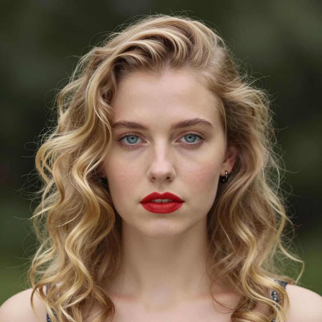 A pale-skinned woman with short, blonde hair. She has intense blue eyes and bright red lipstick, slightly parted lips. She wears a white shirt with visible collar. Overexposed lighting creates a high contrast. She looks directly at the camera with a focused expression. The background is mostly white with a faint red gradient on the right.