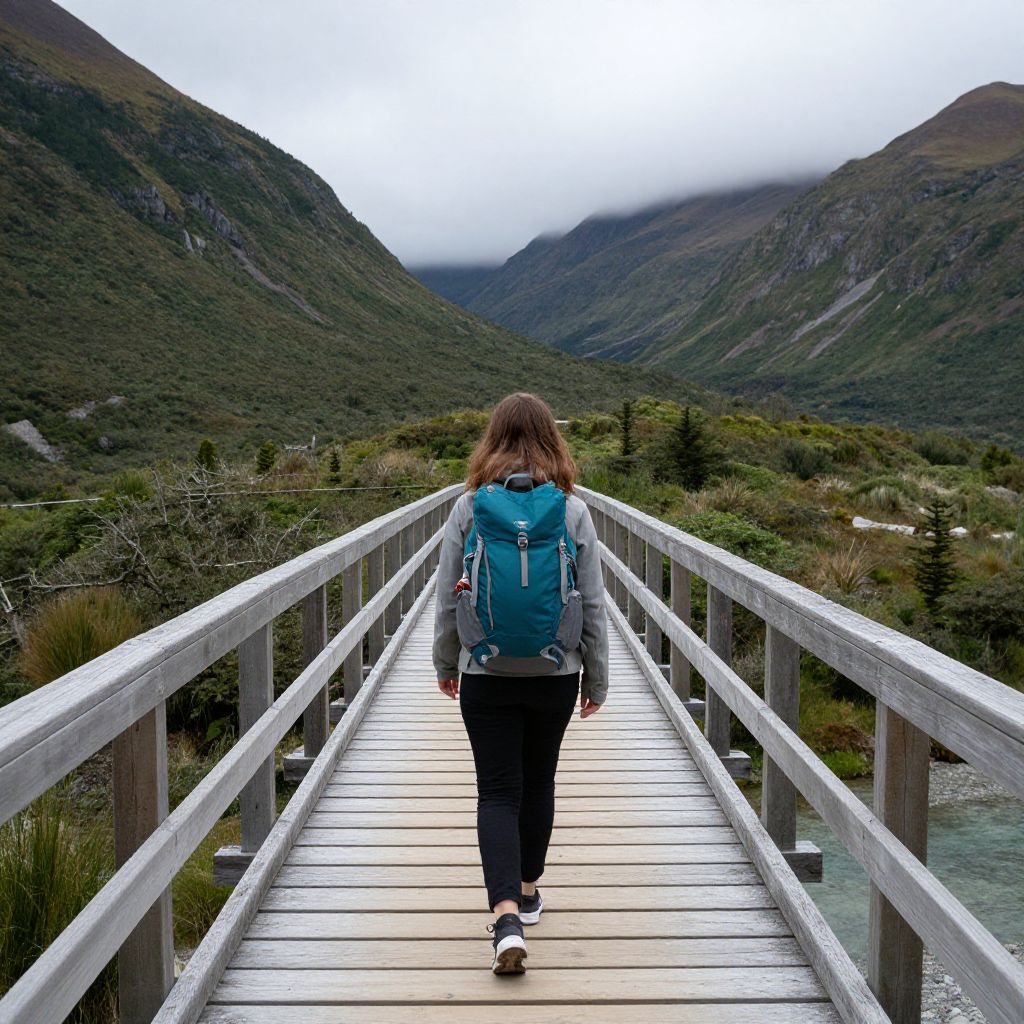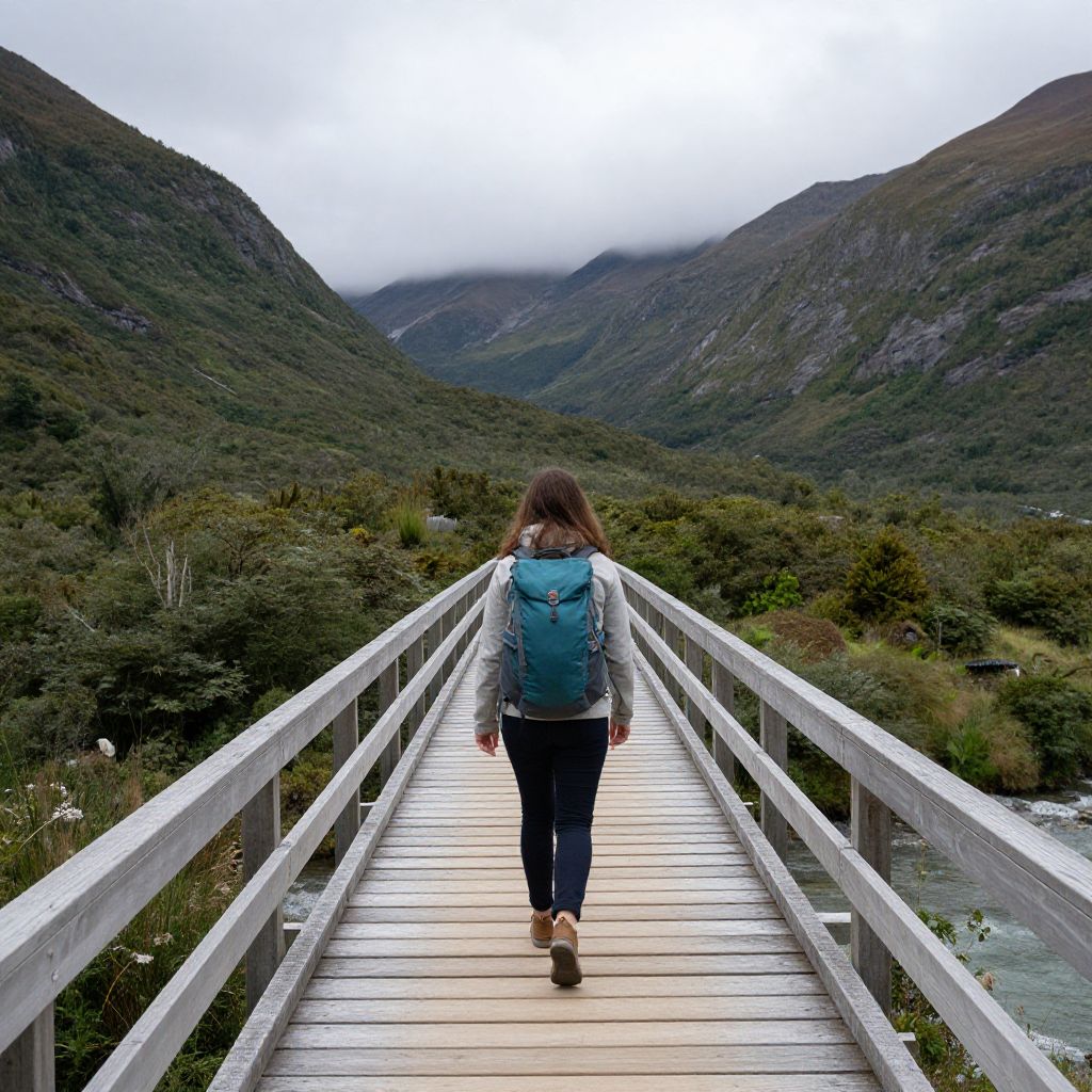 Woman walking alone on a wooden bridge, carrying a teal backpack, surrounded by lush green mountains and a serene valley beneath a cloudy sky during her journey along the Carretera Austral itinerary.