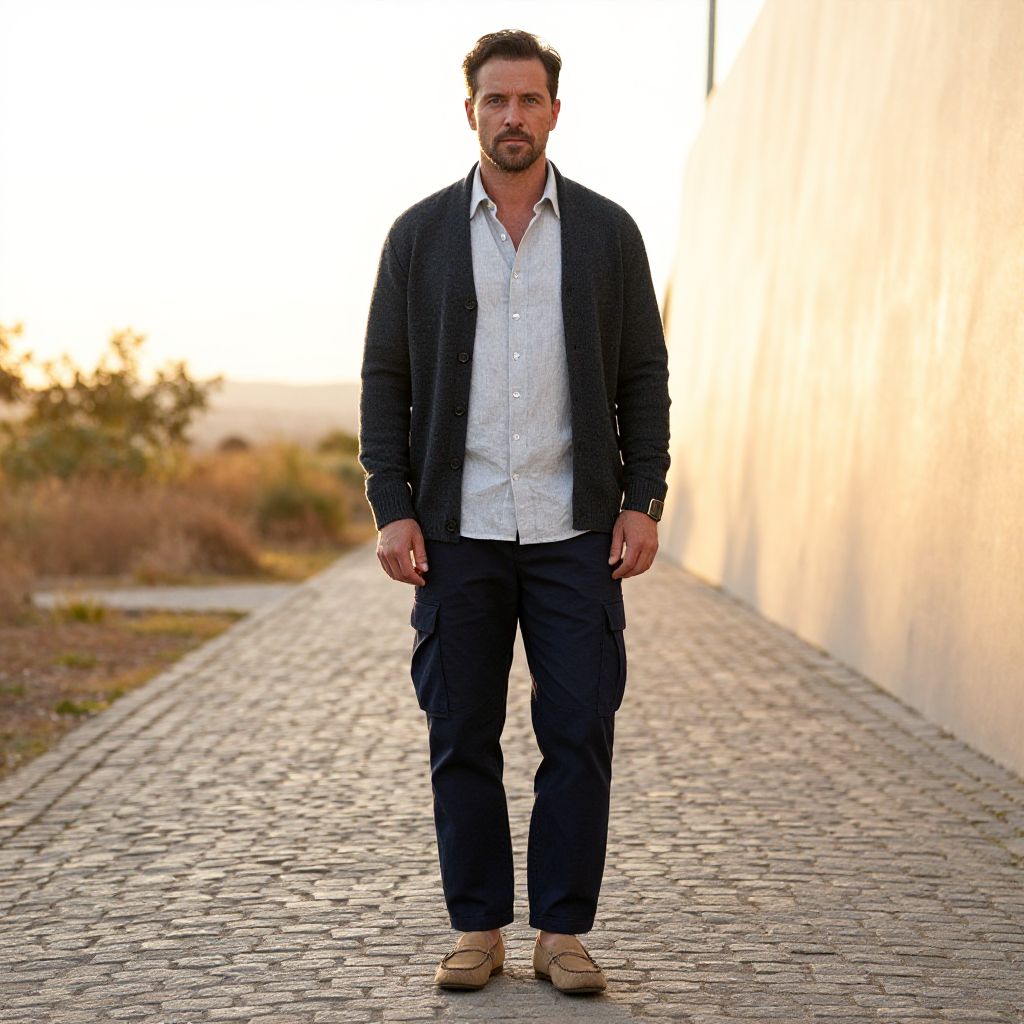 A man, charcoal bamboo fiber cardigan, navy sustainable cargo pants, light grey linen shirt, tan slip-on loafers, narrow cobblestone path, warm sunset glow, modern minimalist style, relaxed expression Man has masculine face and piercing eyes