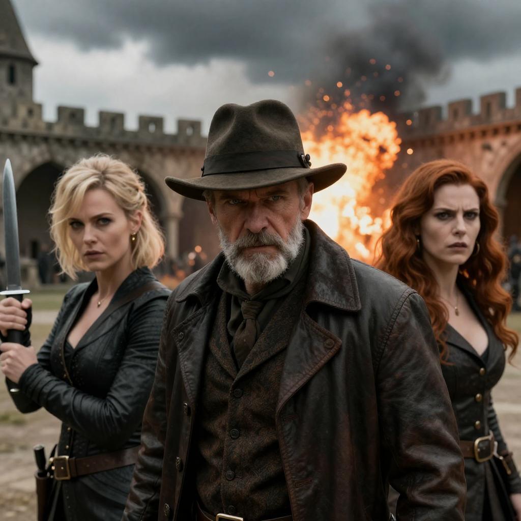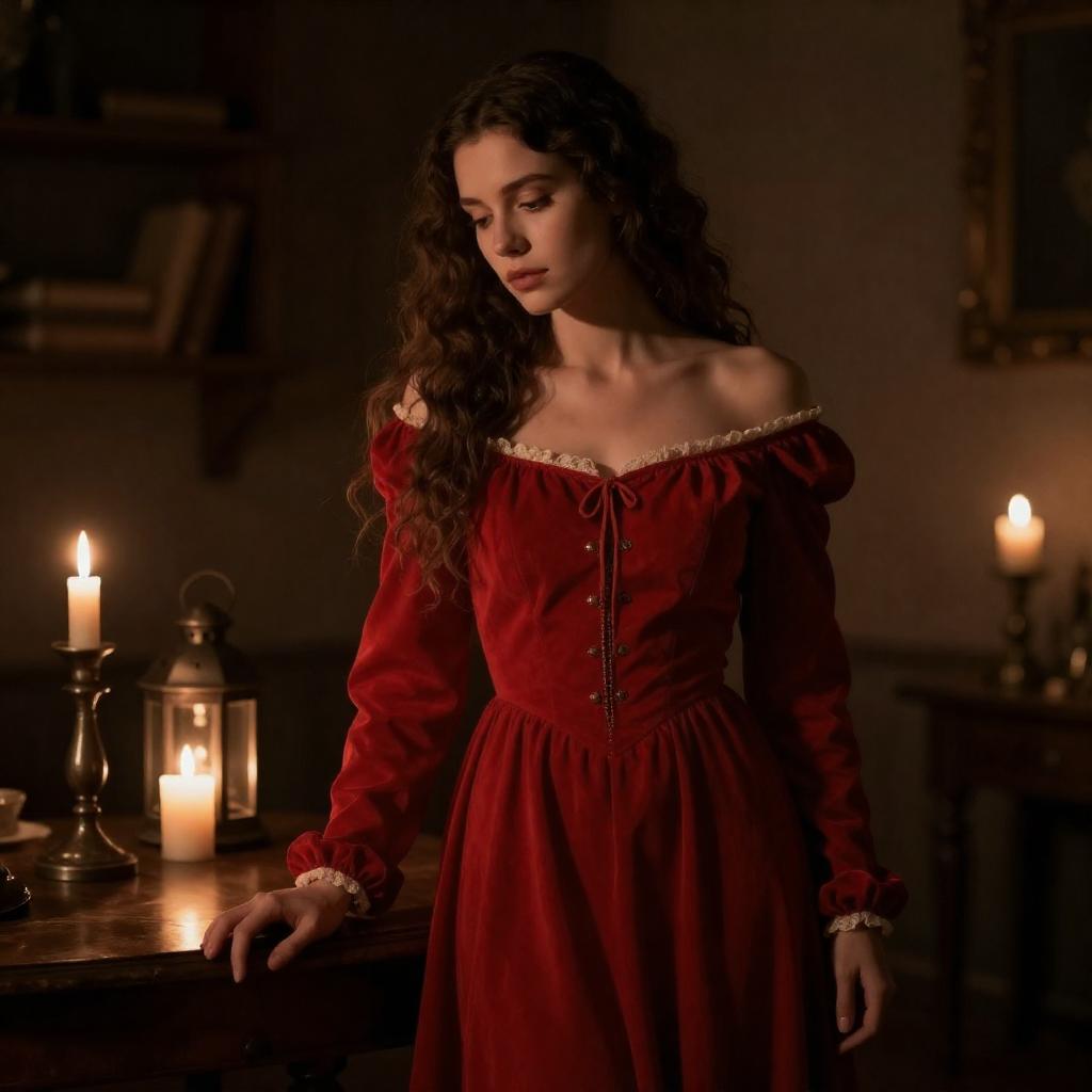 Photograph of a dimly lit, candle-lit room. Young woman with curly blonde hair, intense expression, wearing a red velvet robe, sits at a table. Older man with a beard, wearing a brown hat and cloak, stands to her right, pouring liquid from a flask. Table with food, candles, and a lamp in the background. Warm, ambient light.