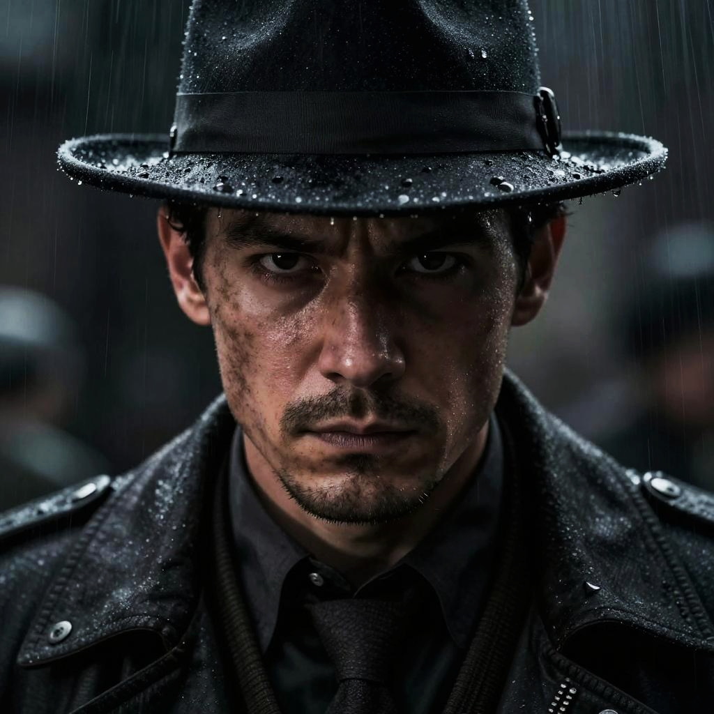 A stylishly dressed man stands confidently under a vintage streetlamp on a rain-soaked urban street. Dressed in a classic coat and fedora, he gives off a mysterious, film noir vibe, evoking a sense of intrigue and sophistication in this atmospheric nighttime scene.