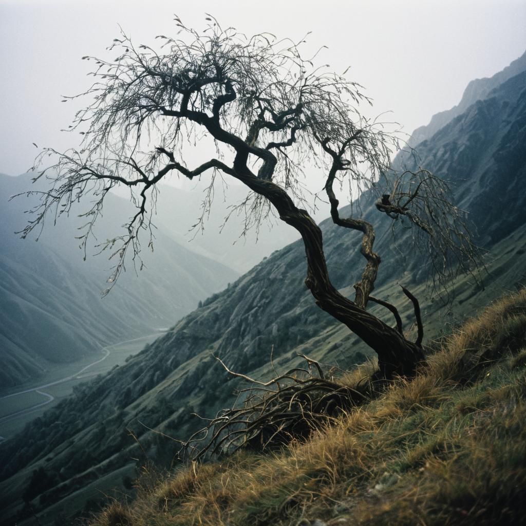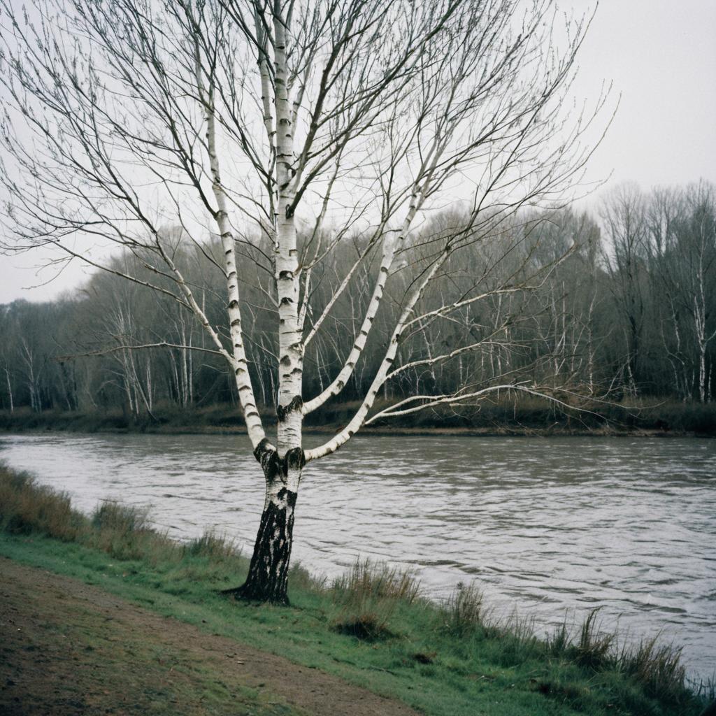 A silver birch tree with white bark and black markings standing alone by a riverbank. The river flows calmly with a background of leafless trees under an overcast sky. The grassy riverbank is damp, and the scene has muted colors with a film-like, photorealistic quality.