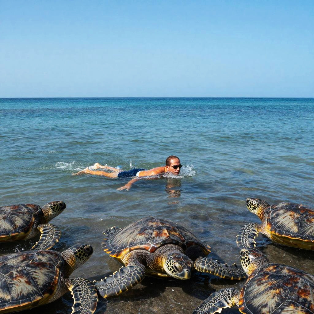 The photograph captures a lone swimmer in the ocean surrounded by sea turtles, ultra vibrant shot with an 85mm lens and a shallow depth of field to emphasize the beauty and isolation of the subject. Shot in Super-Resolution and ProPhoto RGB with sharp focus, the image is ultra-realistic, with hyper-realistic textures that enhance the photorealistic detail. The final image is a full-body shot with a cinematic composition.