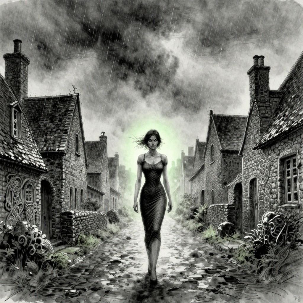 Digital black-and-white drawing: Silhouetted woman in tight dress walks down a rain-soaked, cobblestone alley between stone cottages,