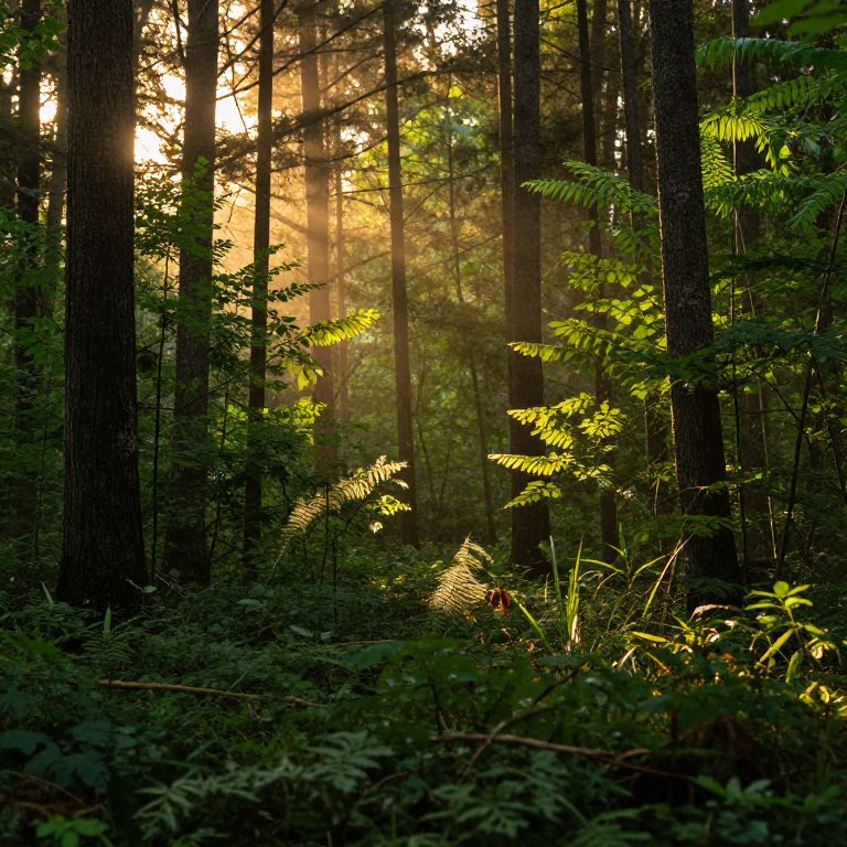 Photograph of a sunlit forest with tall trees, bright golden sunlight filtering through, casting rays, and green ferns and foliage in the foreground.