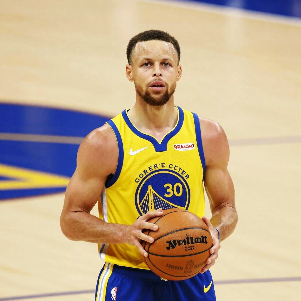 Creative rendering of Steph Curry holding a basketball, modern graphic style, vibrant color contrasts, highlighting determination and focus, basketball court background.