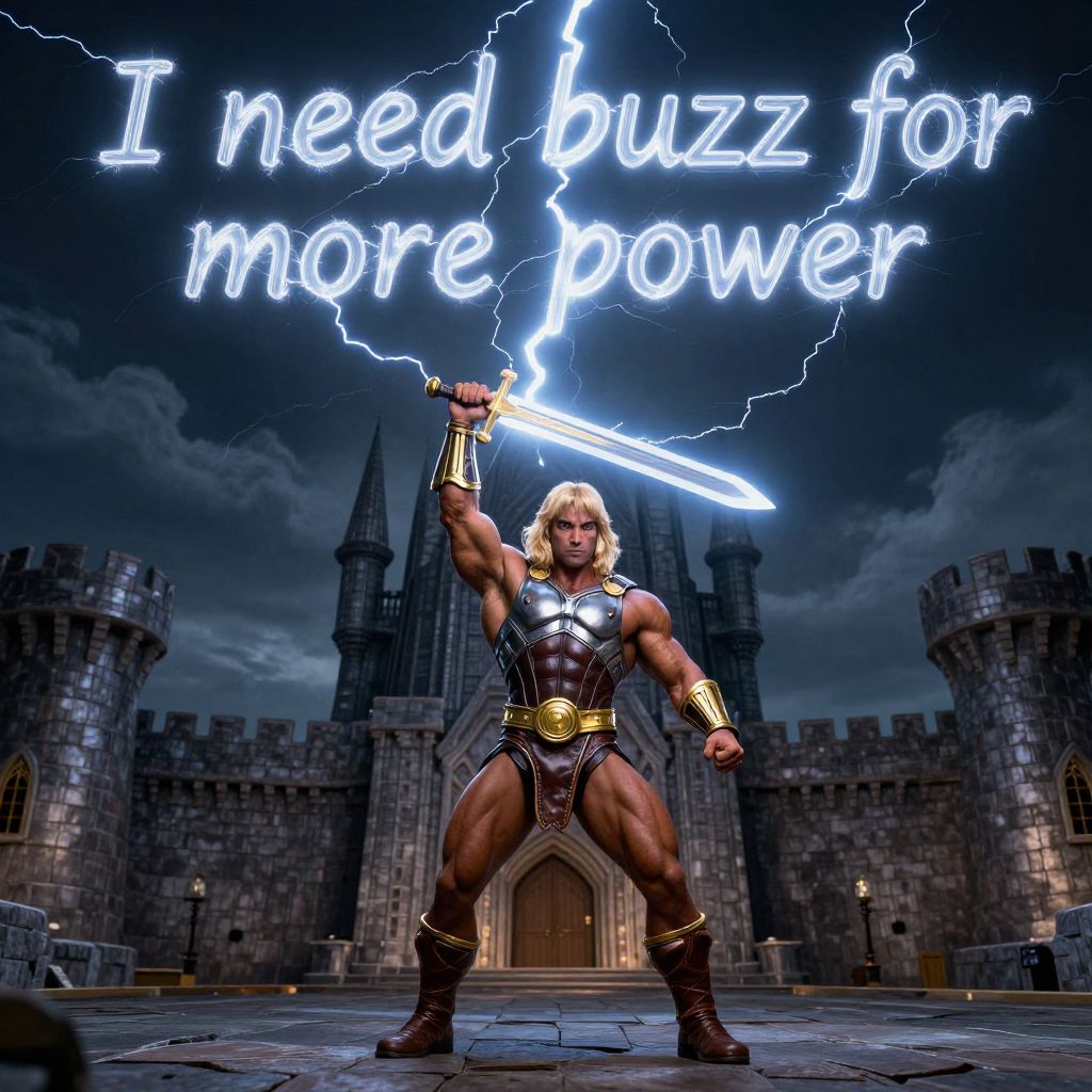 Photograph of a medieval fantasy market scene. A bearded man in brown clothing, with dark skin, stands behind a wooden stall selling enchanted swords. The stall has a beige tent, illuminated by a single light bulb, and displays various swords with colorful gems. A thought bubble above a silver-armored knight with a helmet reads, "I need more Buzz." The knight stands to the right, with a mix of metal textures and detailed armor. The background shows blurred market tents and greenery. A blackboard lists "Bundles" and "Prices" in white chalk. The scene is vibrant and detailed, evoking a fantasy setting.