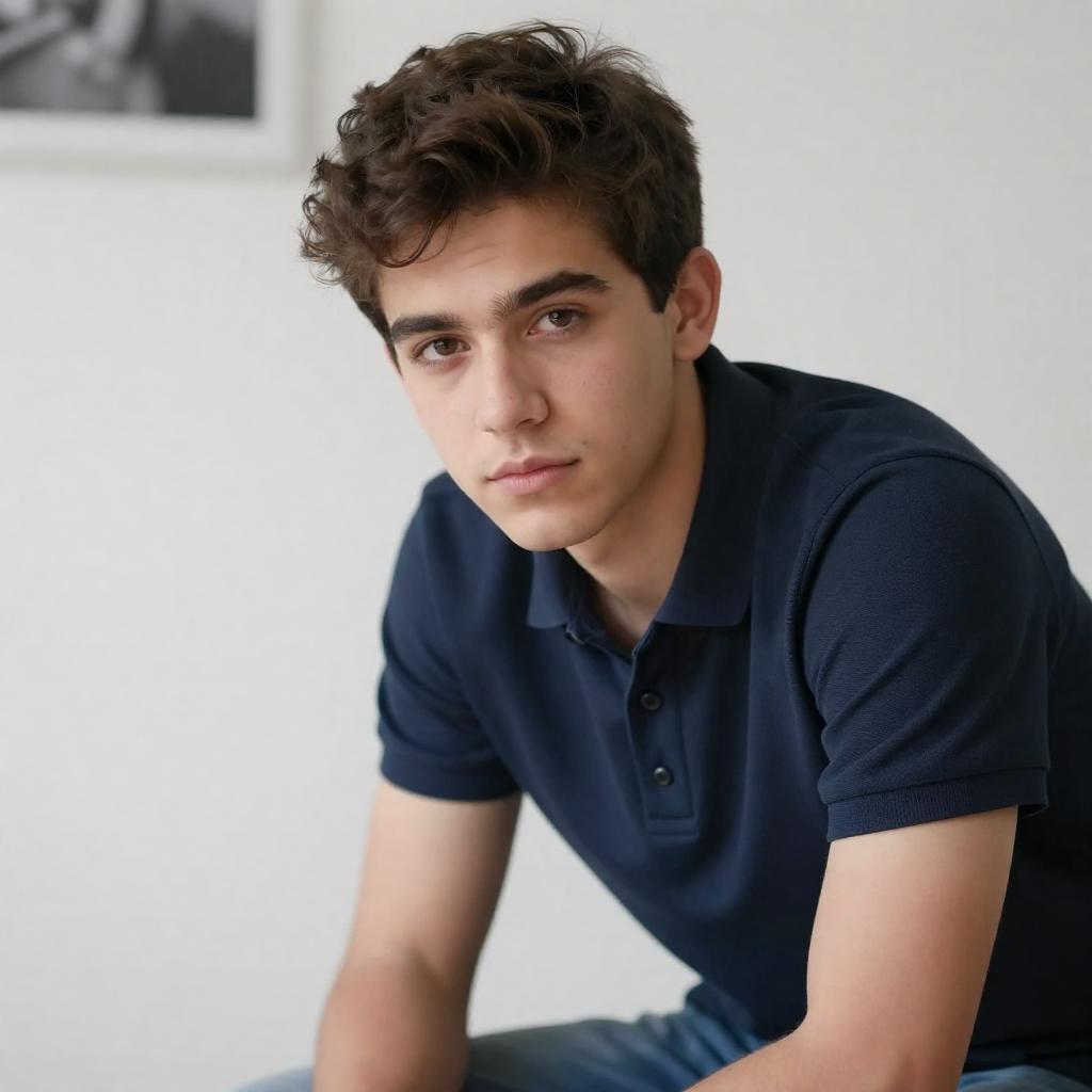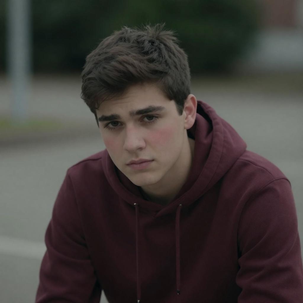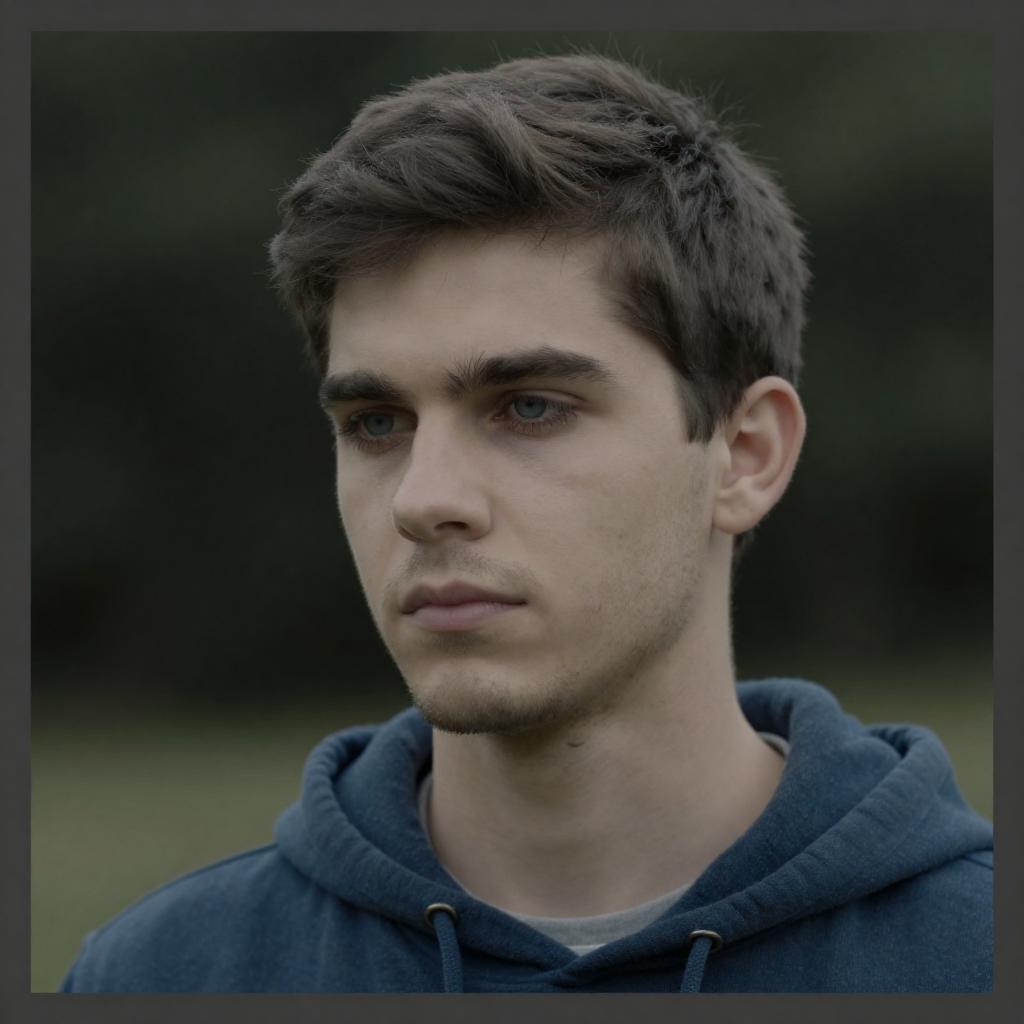 Photograph of a young man with light skin, brown hair, and intense brown eyes, leaning forward slightly. He wears a black jacket over a dark shirt. The background is blurred greenery. His expression is serious and focused. The lighting highlights his facial features and hair ure.