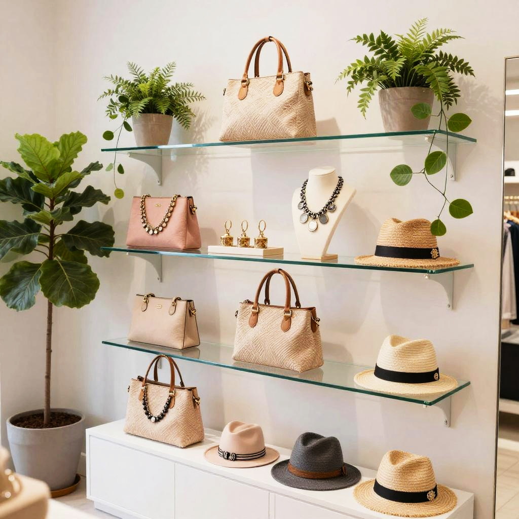 Fashionable accessoire showcase in a bright boutique setting, highlighting handcrafted handbags, statement necklaces, and trendy hats arranged on sleek glass shelves, surrounded by lush green plants and soft pastel colors for an inviting atmosphere.