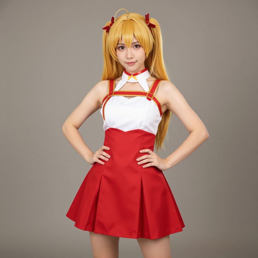 This is a digital CGI image of a young woman with long, straight, blonde hair adorned with red ribbons. She has light skin and blue eyes, and she stands confidently with hands on hips. She wears a white, sleeveless top with red straps and a high neckline, paired with a red, pleated skirt. The background is a plain, gradient gray. The style is anime-inspired, with a focus on bright, contrasting colors and a clean, polished finish. The woman's expression is neutral, and she gazes directly at the viewer.