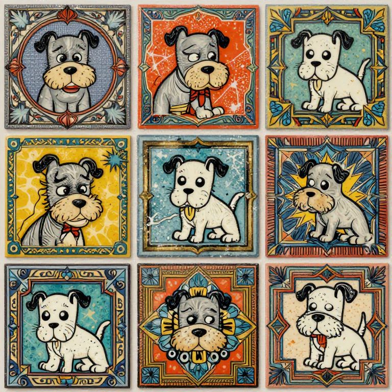 This is a colorful, digital cartoon-style illustration of nine different depictions of a dog, arranged in a 3x3 grid. Each dog has a distinct expression and is set against a vibrant, patterned background. The backgrounds feature various designs, including circular, square, and diamond frames with ornate borders and star patterns. The dogs vary in color, with some being grey and white, others white, and some grey. Each dog has a unique expression, ranging from sad to playful. The illustration uses bold lines and bright colors, with a mix of red, blue, yellow, and orange backgrounds. The overall style is whimsical and playful.