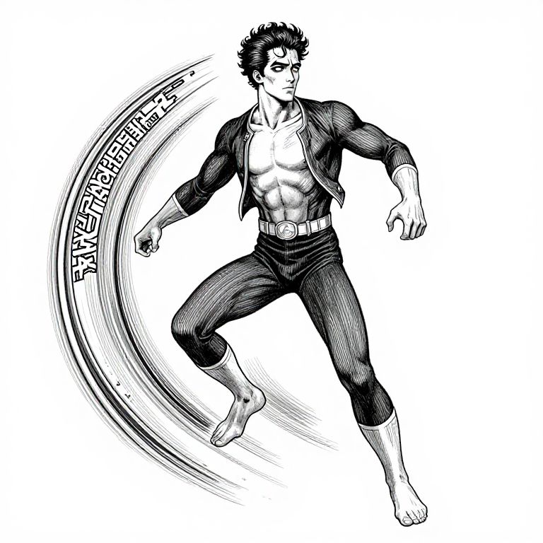 Toshi Yoshida gay superhero, Frankensteins Monster drawing, illustration, Alphonse Mucha, Spinning, Hand-drawn, Keith Haring, Full Body Shot, White Background,