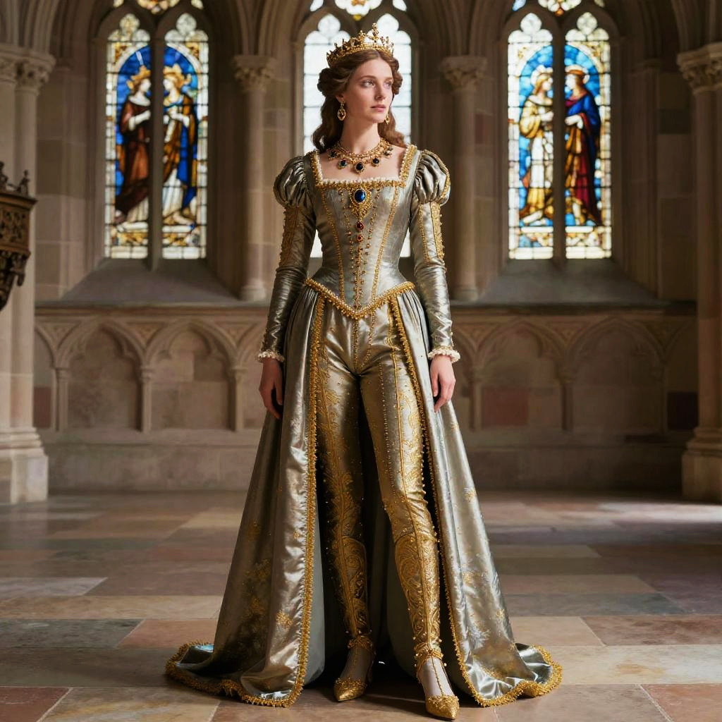 An elegant medieval court scene featuring a lady wearing luxurious medieval tights with gold thread, silk gowns, ornate jewelry, grand hall with stained glass windows