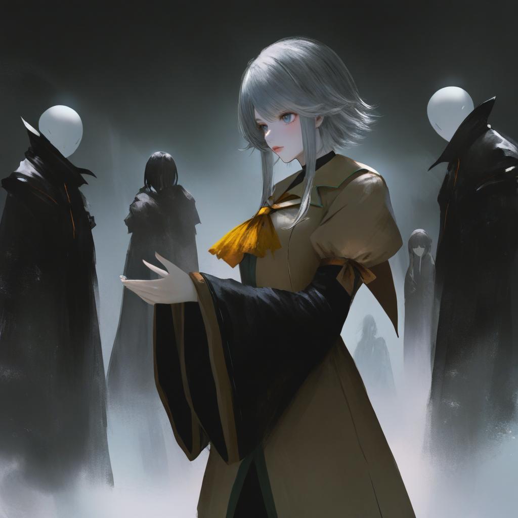 Houlen yabusame, len'en, 1other, grey eyes, grey hair, short hair, short hair with long locks, brown coat, short over long sleeves, puffy short sleeves, wide sleeves, ascot, by artist aoi ogata, animagine